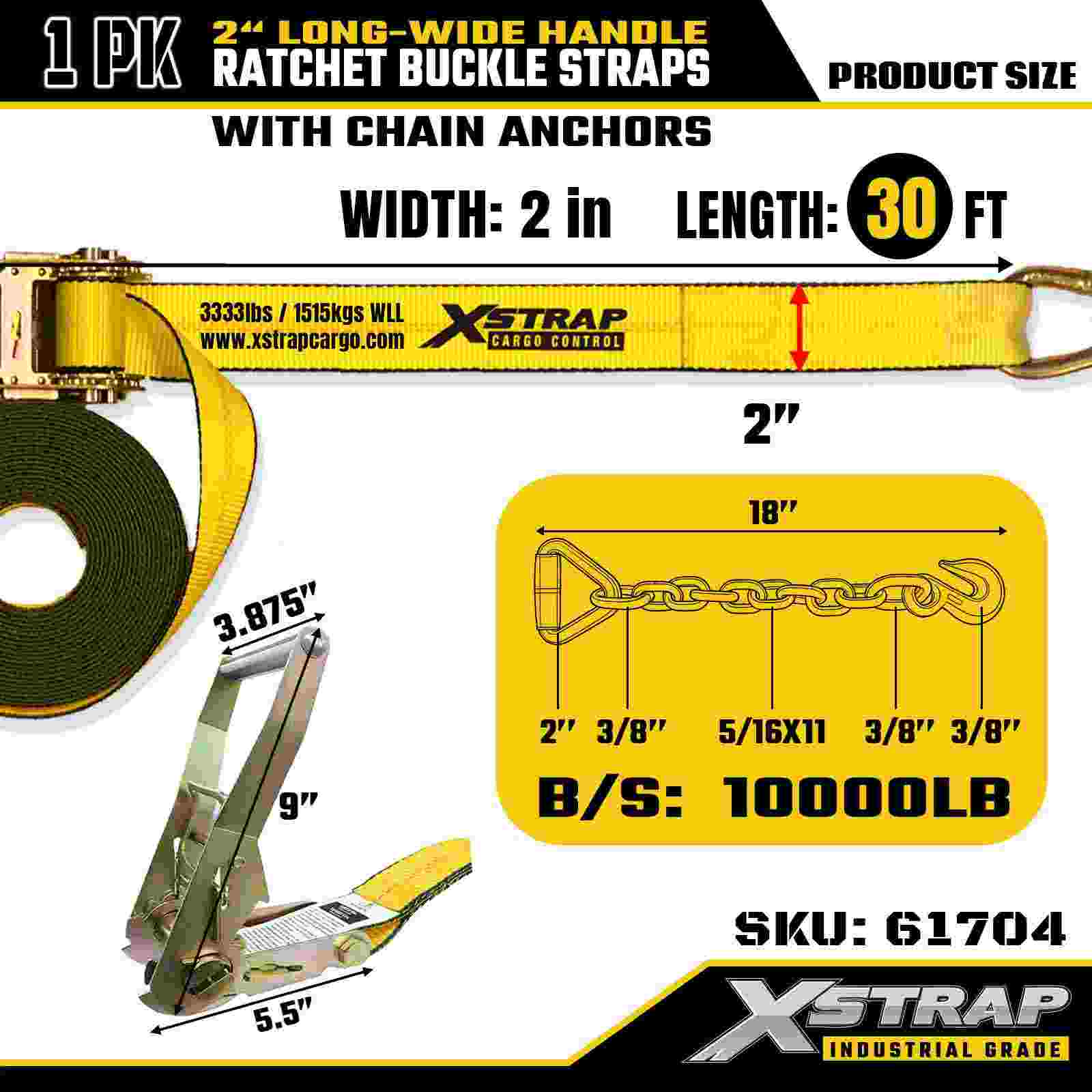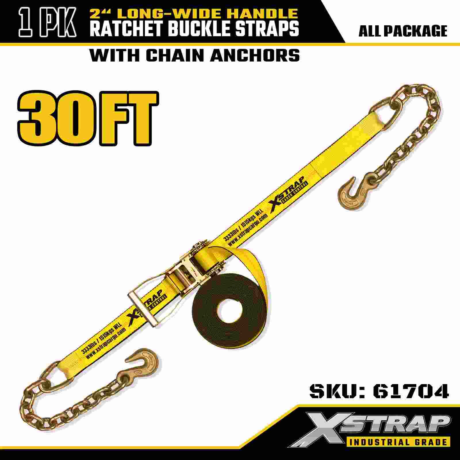 Xstrap 61704 تسمههای سگک جغجغهدار دستهدار عریض 2 اینچ × 30 فوت (1 بسته) - قلابهای زنجیری، 10000 پوند استحکام شکست، تسمه محکم برای حمل بار و تجهیزات