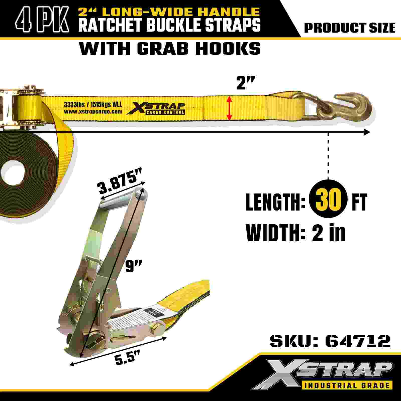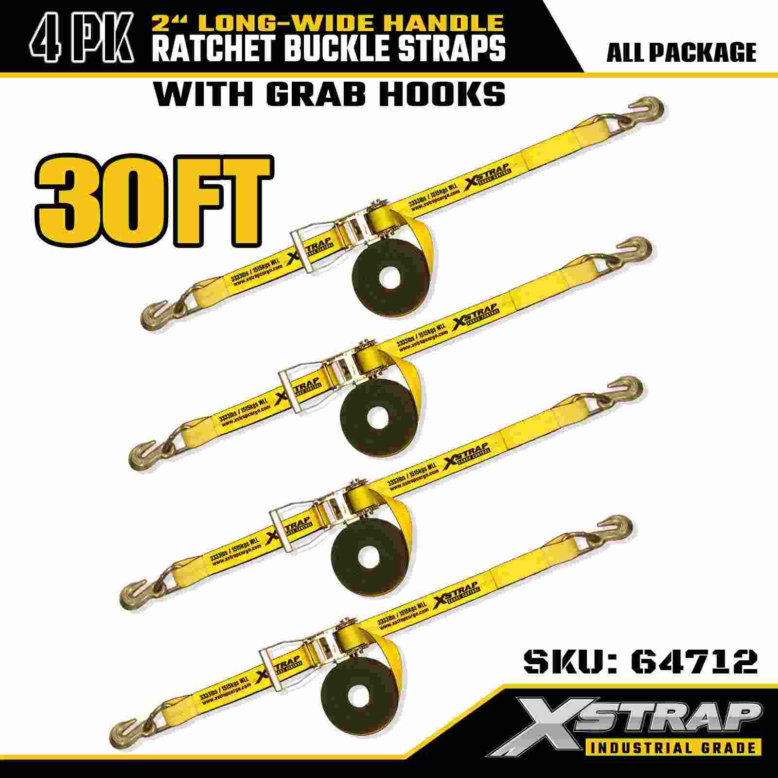 Xstrap 64712 2 اینچ × 30 فوت تسمه سگک ضامن دار دسته عریض (4 بسته) – قلاب های دستگیره، ظرفیت 10000 پوندی، بند کشی سنگین برای حمل و نقل تجهیزات بزرگ