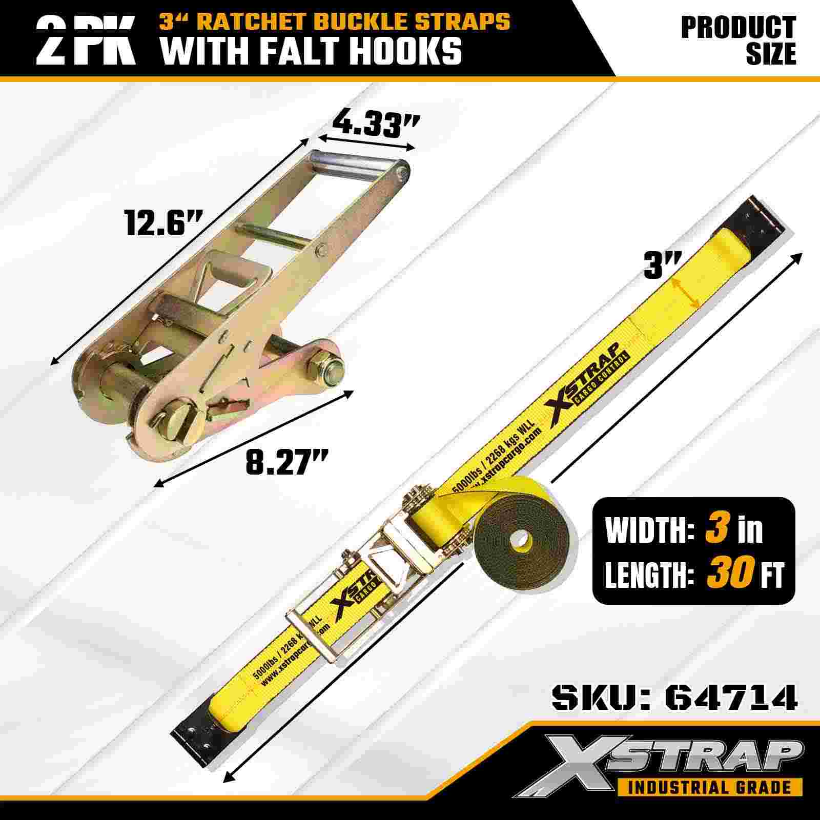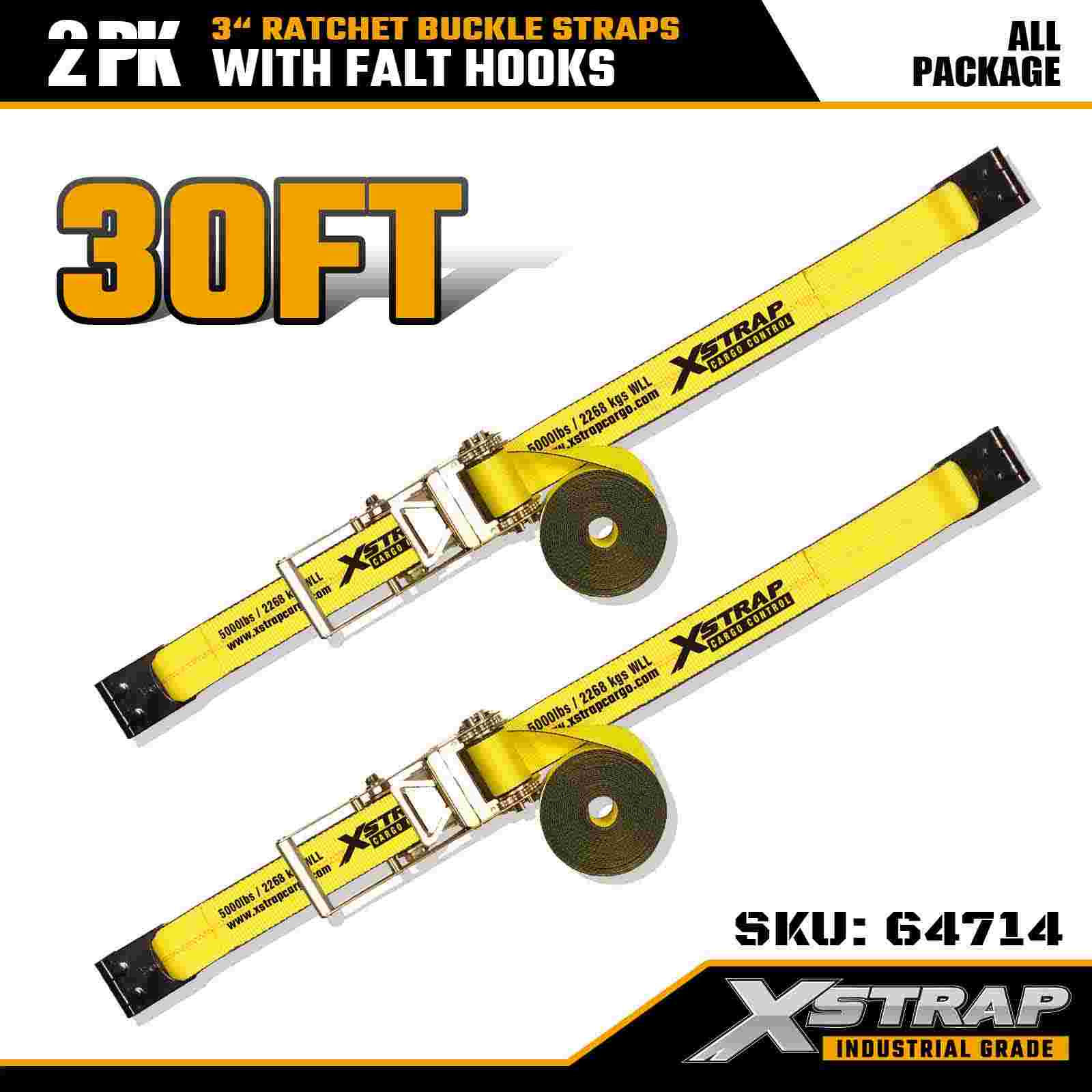 تسمههای سگک ضامن دار 3 اینچی Xstrap 64714 (2 بسته) – قلابهای مسطح، ظرفیت بار 5000 پوندی، استحکام شکست 15000 پوند. این تسمههای سنگین برای کنترل بار حرفهای طراحی شدهاند و برای کامیونها و حملونقلهای صنعتی، حمل و نقل دوگانه و حملونقل دوگانه طراحی شدهاند.