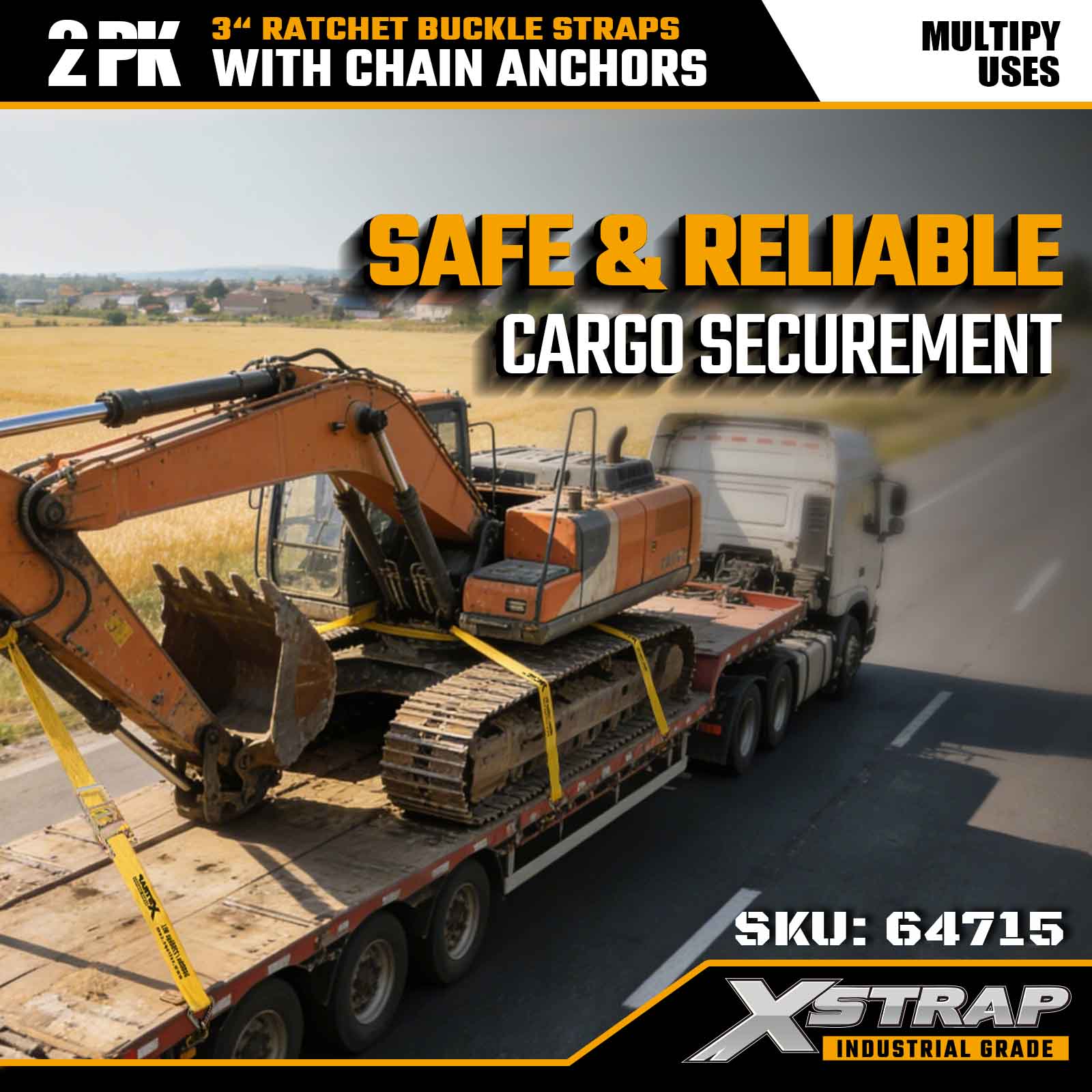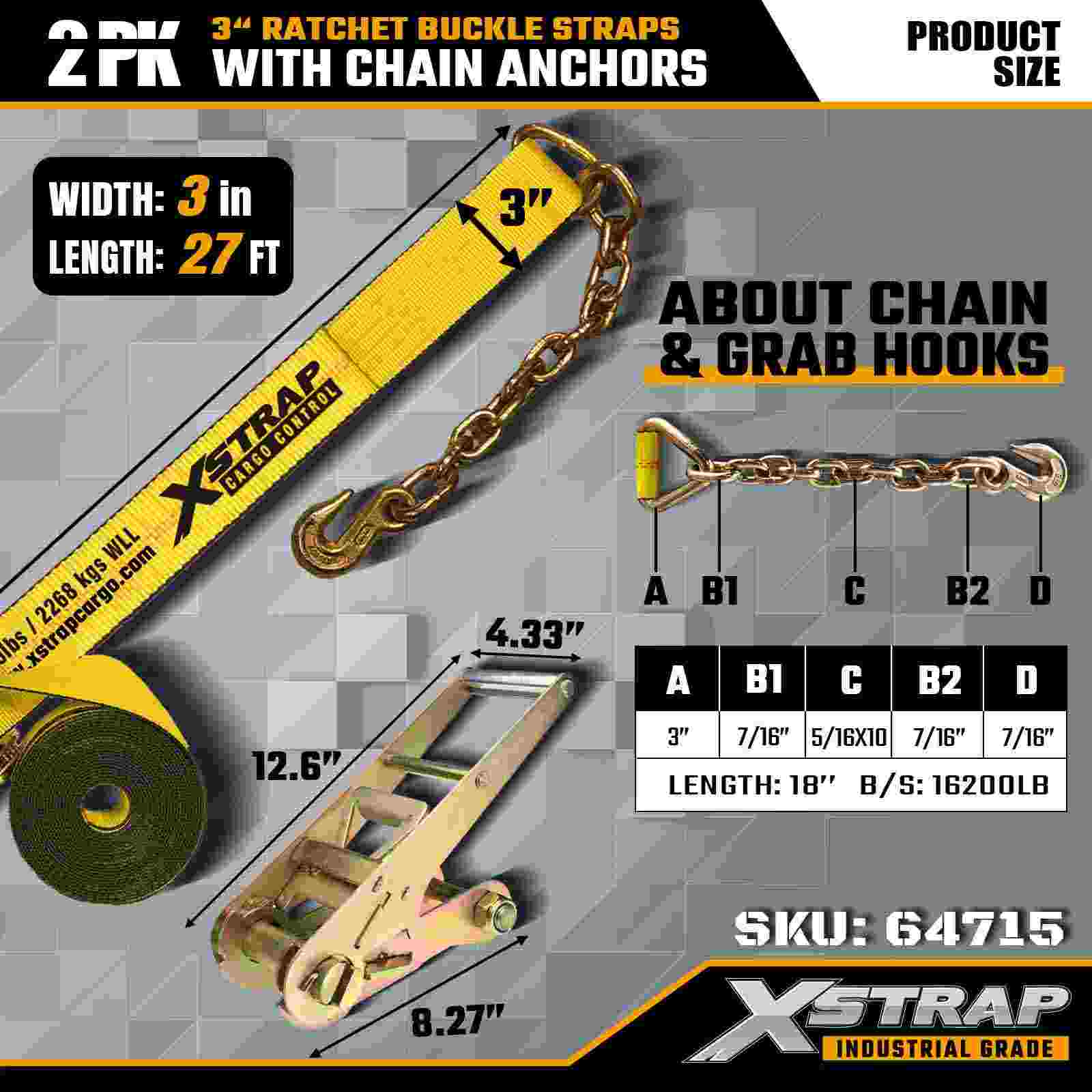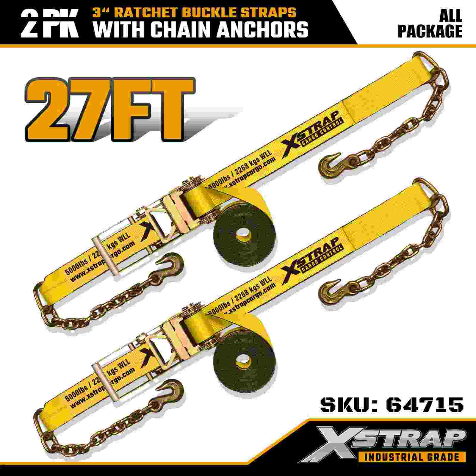 تسمههای سگک ضامن دار 3 اینچی × 27 فوت Xstrap (2-بسته) – مجهز به لنگرهای زنجیری سنگین، طراحی شده برای محیطهای محموله سخت. با محدودیت بار کاری 5000 پوند و استحکام شکست 15000 پوندی، این تسمهها برای کارایی حرفهای، انعطافپذیر و ایمن هستند. حمل و نقل ماشین آلات و حمل و نقل صنعتی.
