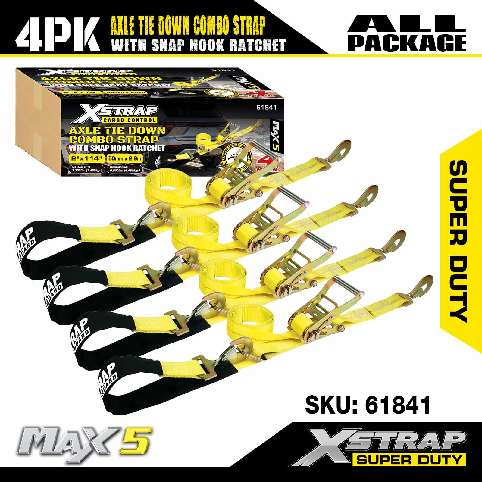 - 4 بسته بند 114 اینچی محور: بسته خودکار کمند همه کاره برای عبور از رینگ های وسیله نقلیه حمل شده استفاده می شود، همچنین می توان آن را به هر قسمت محکم از چرخ، محور یا چارچوب محکم کرد.