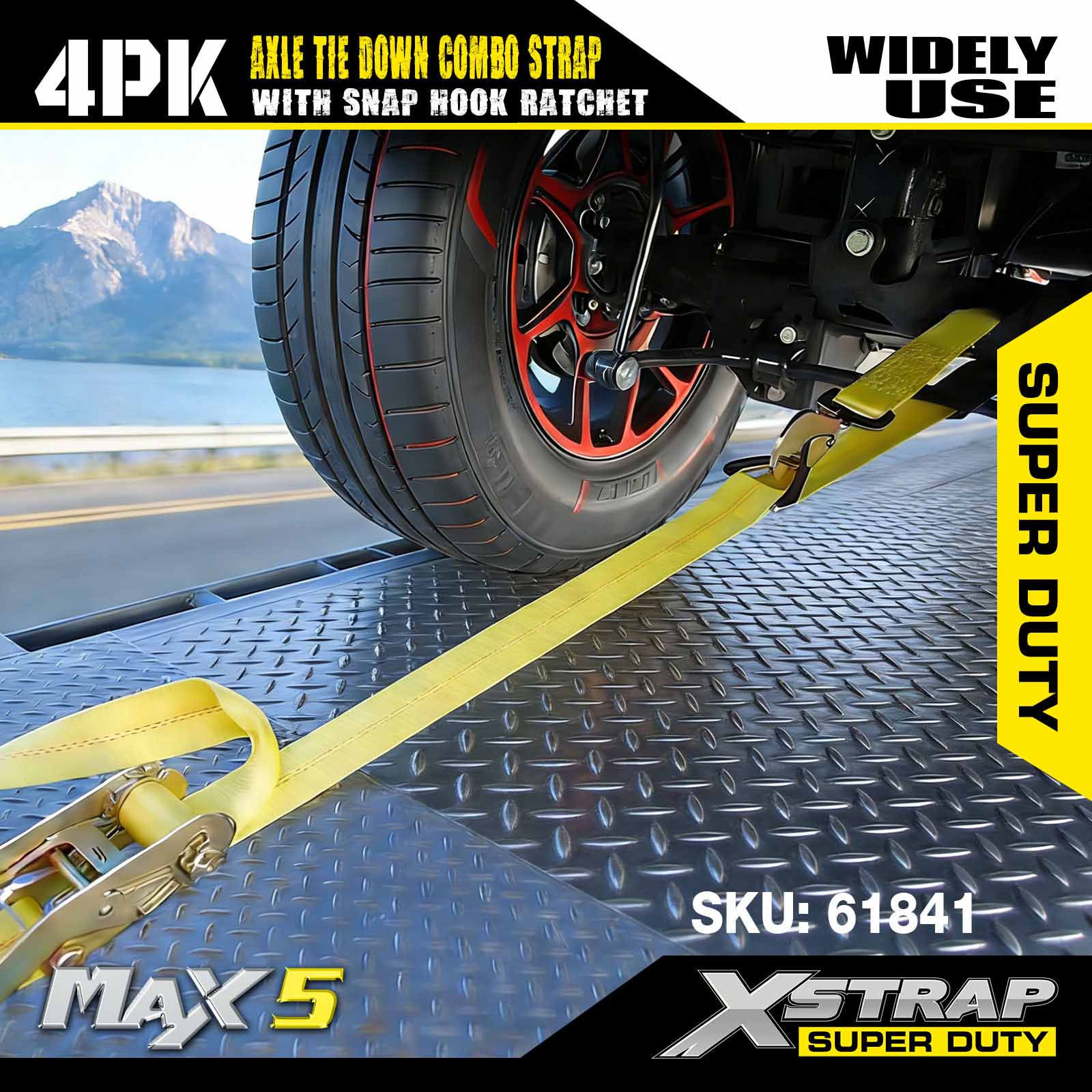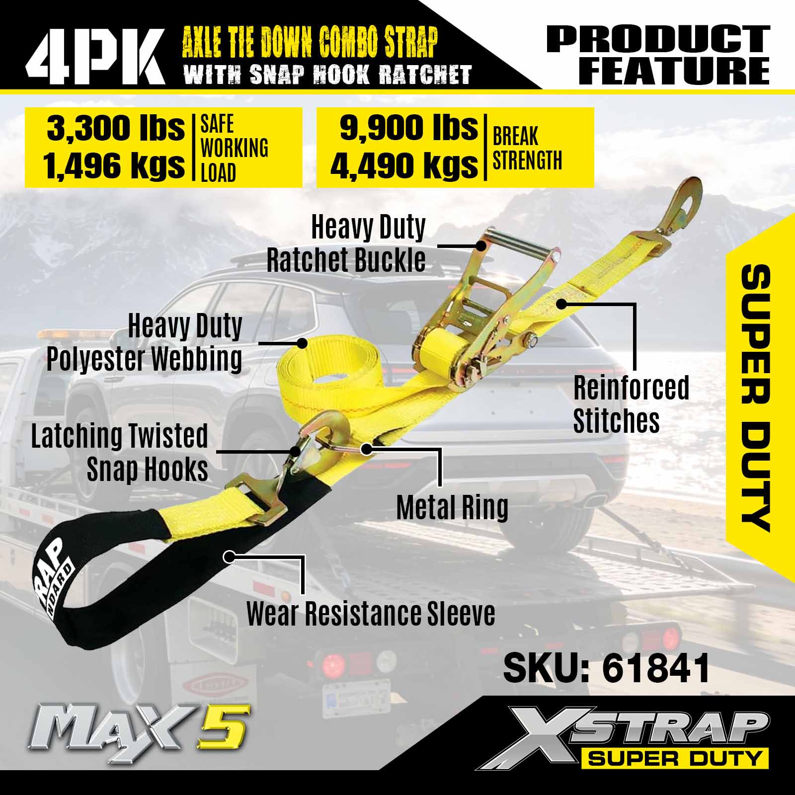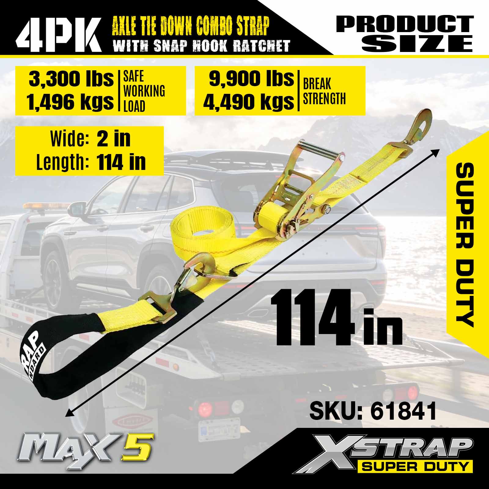 - بستن آسان و ایمن خودرو: تسمههای چرخ دارای پوشش عریض 2 اینچی برای اصطکاک کمتر و ساخته شده از مواد پلیاستر درجه صنعتی با پوشش UV و مقاومت در برابر سایش برای حداکثر استحکام حملونقل است. تست آزمایشگاهی با بار کاری ایمن 3300 پوند و استحکام شکست 10000 پوند.