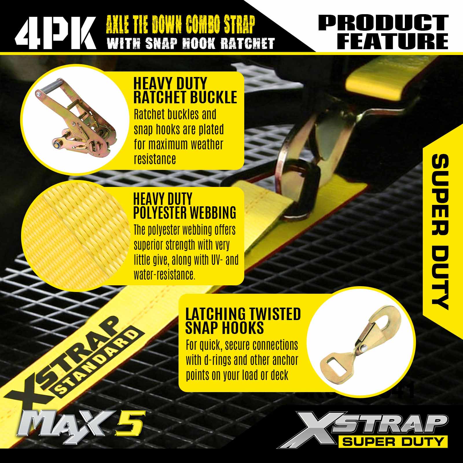تسمههای ضامن دار سنگین Xstrap - کیت حمل خودرو 4 بسته با قلاب محکم - 10000 پوند استحکام شکست - بند بند حرفهای خودرو