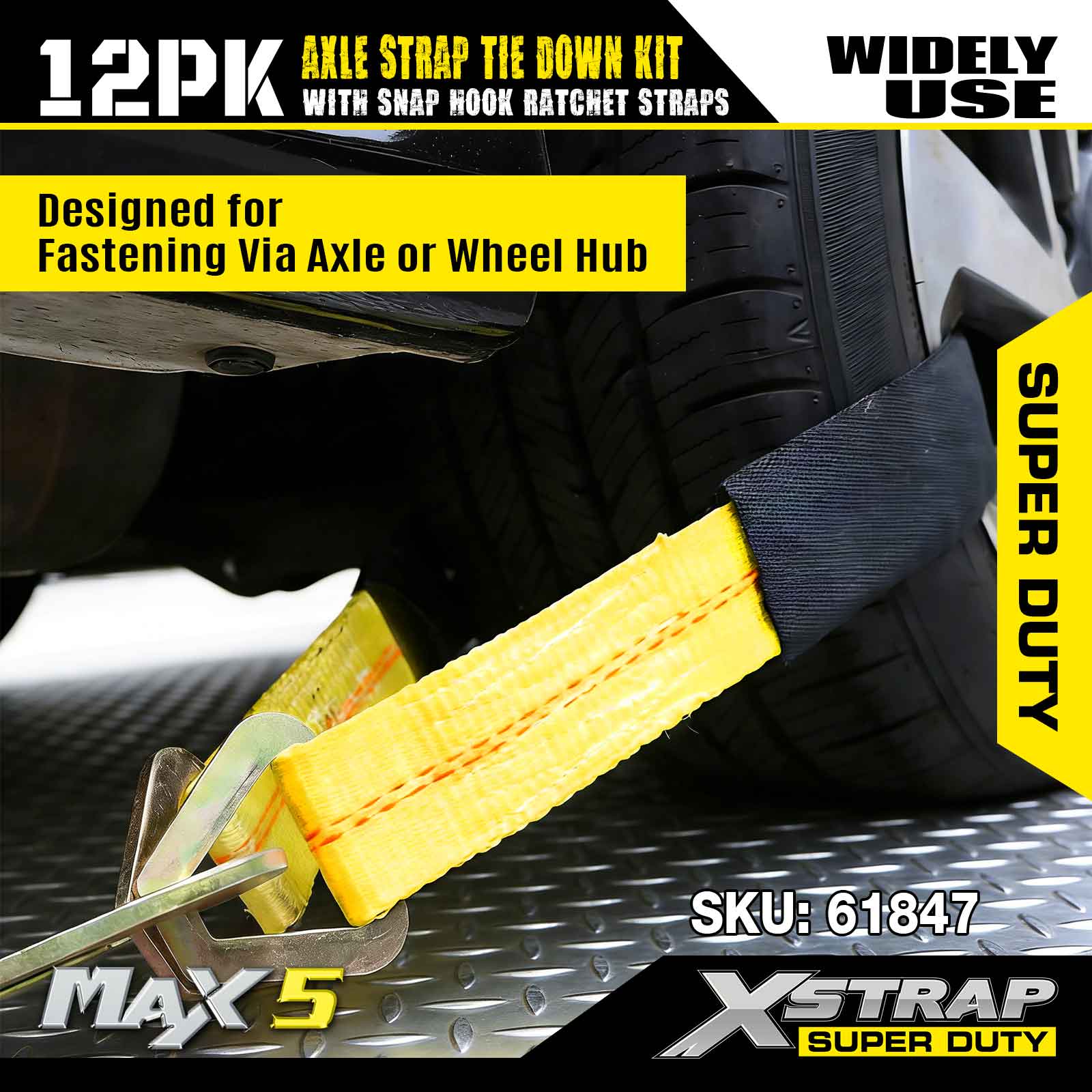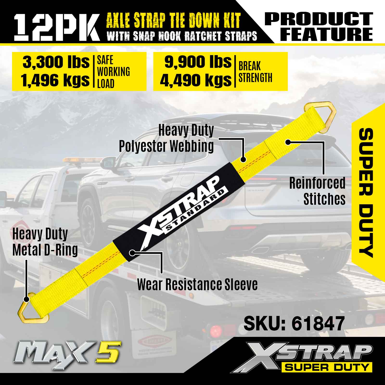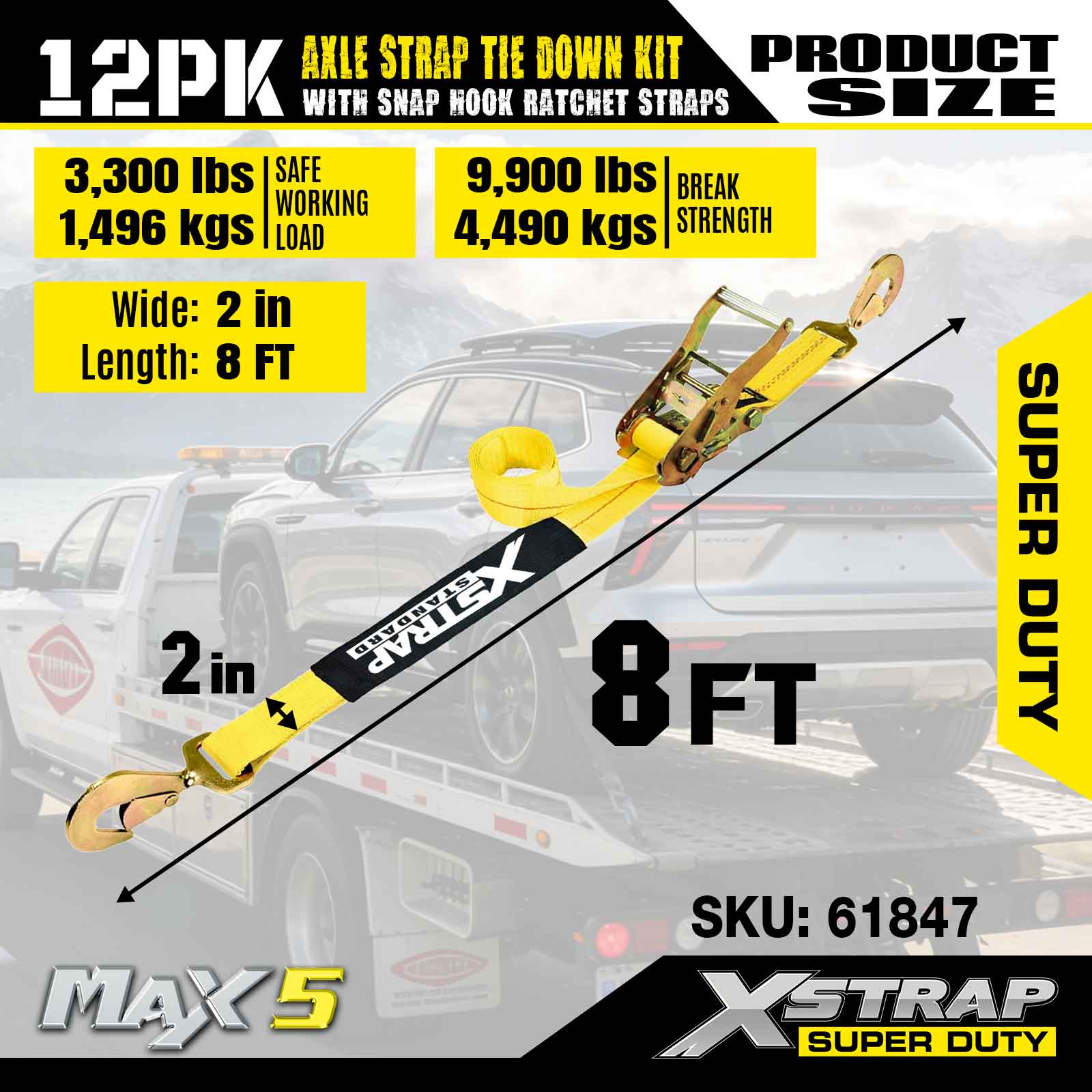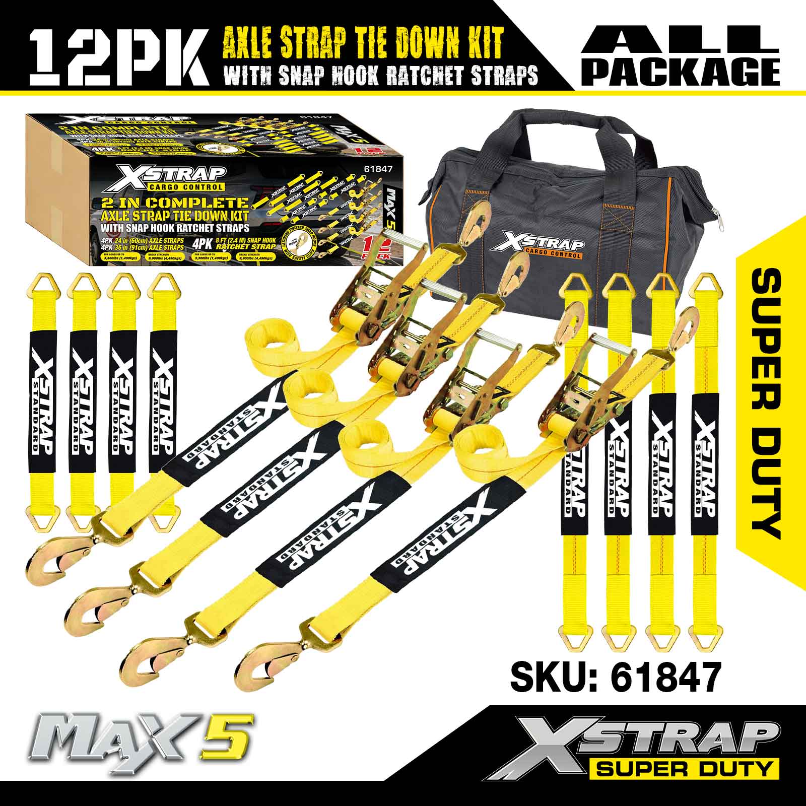 کیت اتصال تسمه محور Xstrap 12PK (با تسمههای قلاب ضامن دار Snap) – Super Duty. دارای بار کاری ایمن 3300LBS (1496KGs) و استحکام شکست 10000LBS (4490KGs).