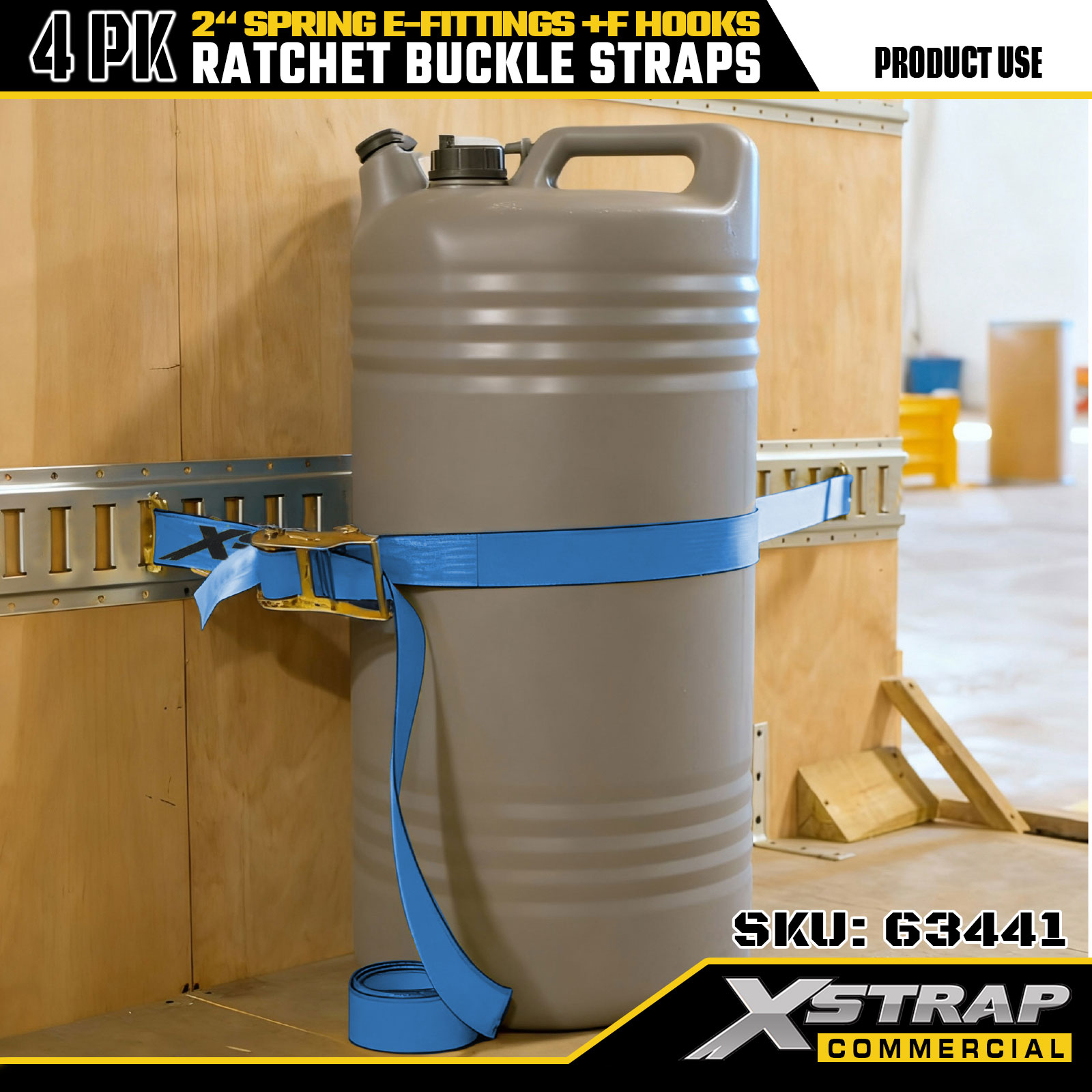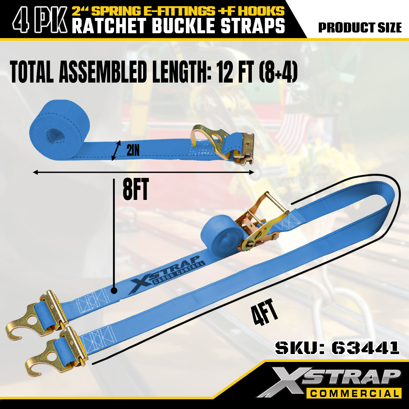 Xstrap 4 Pack Ratchet Tie-down تسمه های 2 اینچی x 12 اینچی پلی استر با اتصالات الکترونیکی فنری و قلاب های F، 733 پوند SWL و 332 پوند استحکام شکست برای کامیون، جابجایی، حمل و نقل عمومی بار