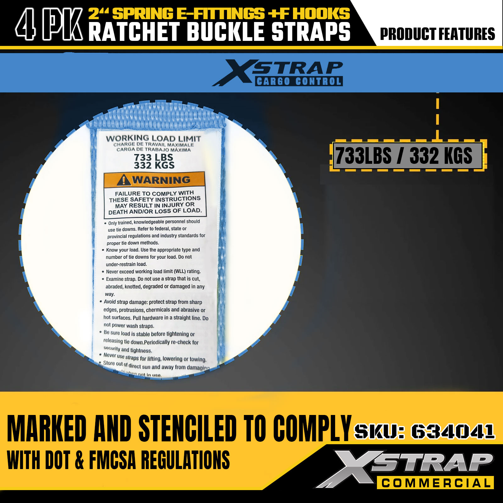 - نشانگرهای ایمنی خوانا: هر بند به وضوح با بار کاری ایمن (SWL) 733 پوند و حداکثر ظرفیت بار 332 پوند برچسب گذاری شده است که دستورالعمل های ایمنی ضروری را برای کاربرد صحیح و ایمن ارائه می دهد.