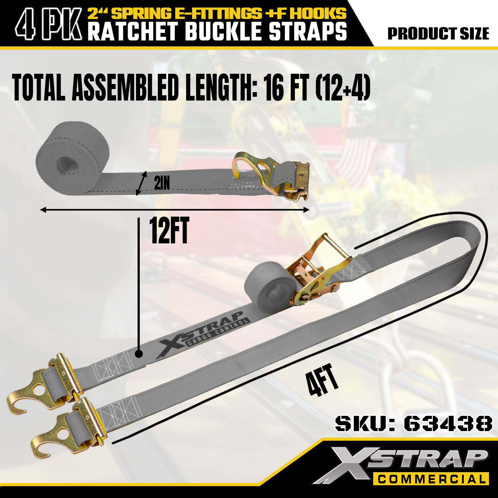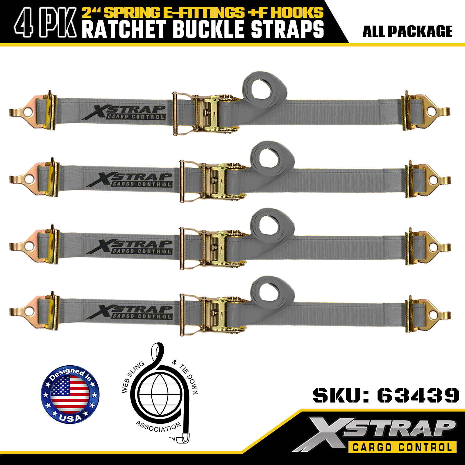 Xstrap 4 Pack 2" x 16' Ratchet بند بند - پلی استر خاکستری با اتصالات الکترونیکی فنری و قلاب های F، 733 پوند SWL برای جابجایی، کامیون و حمل و نقل عمومی بار