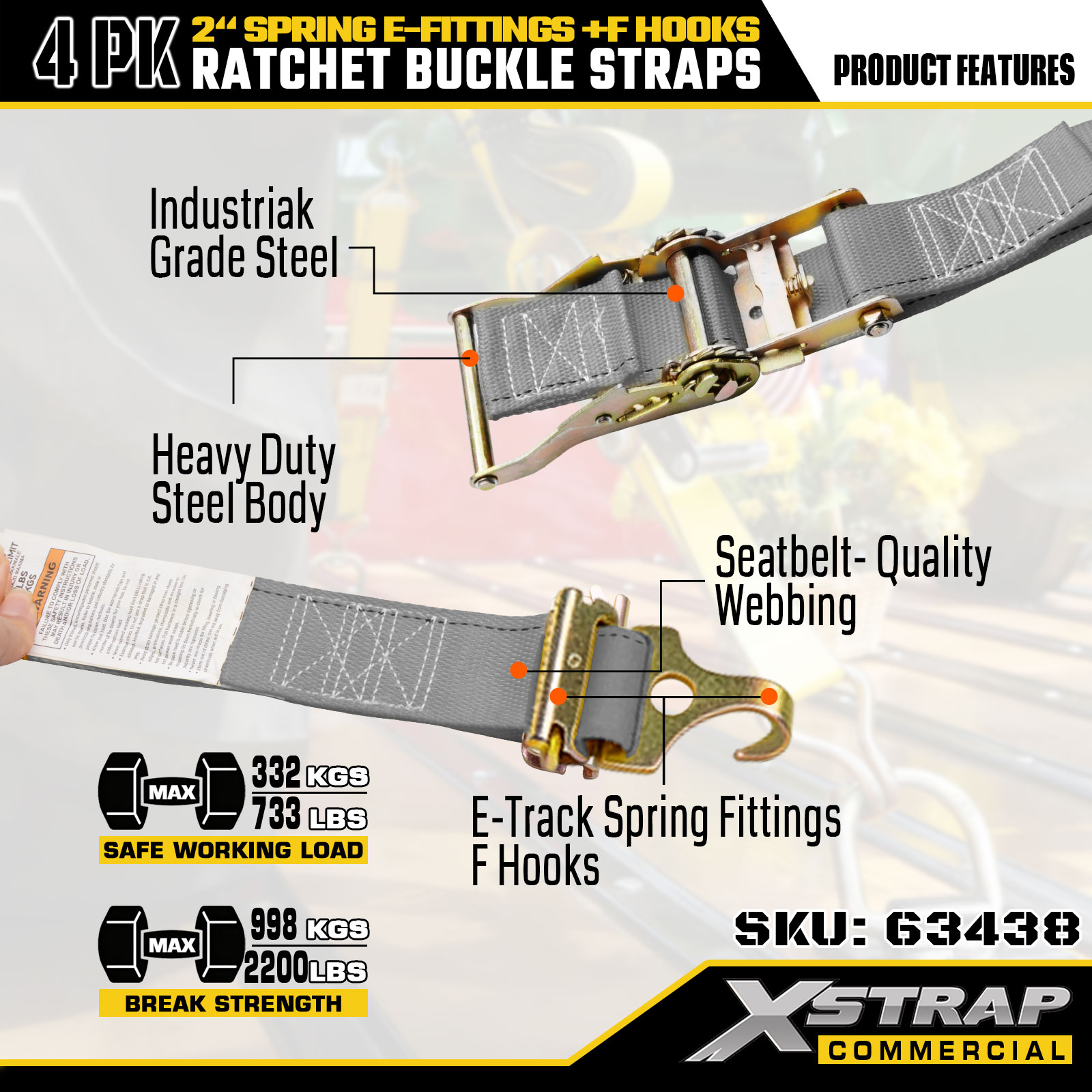 - علائم ایمنی واضح: هر بند دارای برچسب SWL 733 پوندی و قدرت شکستن 332 پوند است که راهنمایی های ایمنی ضروری را برای جلوگیری از بارگذاری بیش از حد ارائه می دهد. گاوصندوق برای محکم کردن جعبه ها، مبلمان، لوازم خانگی و غیره.