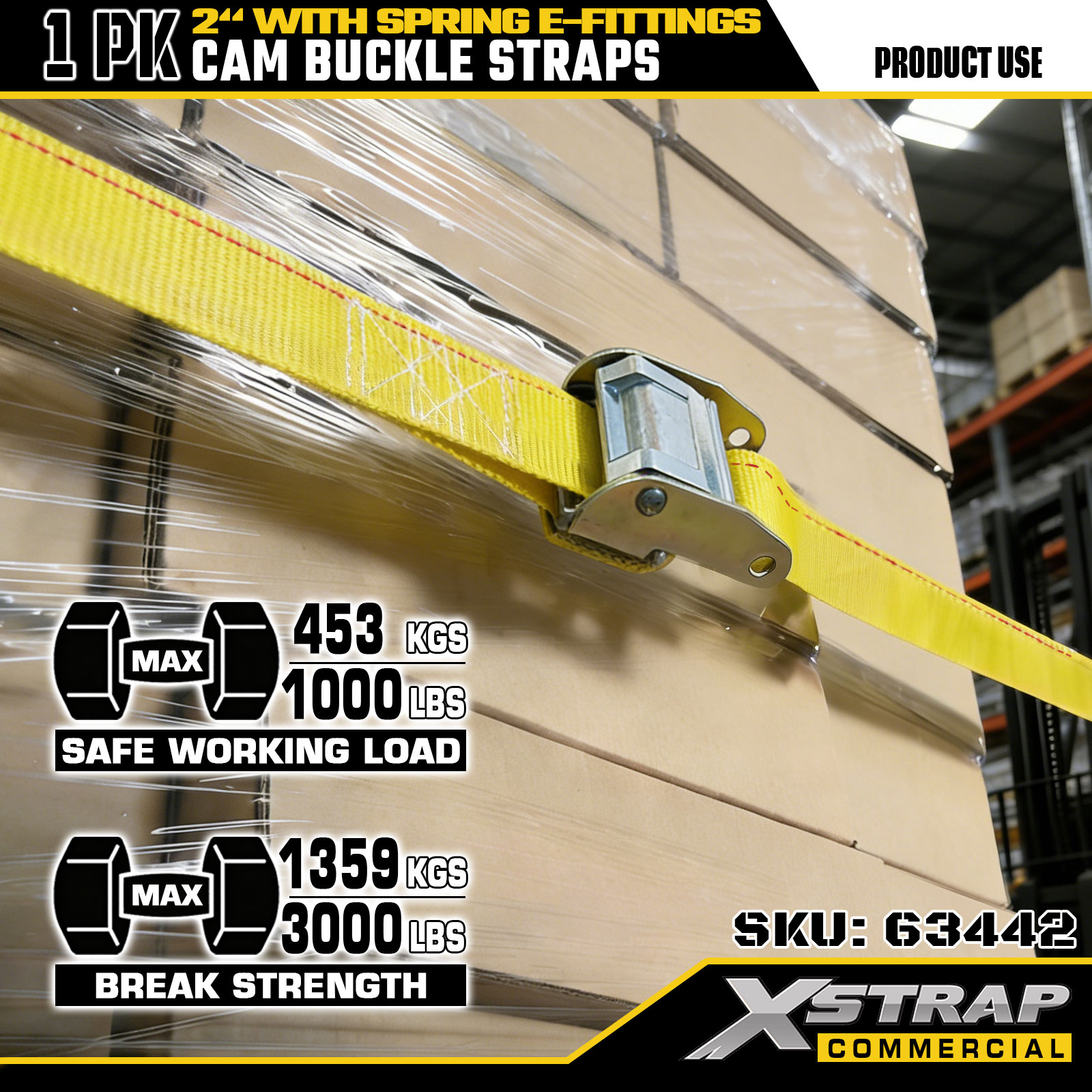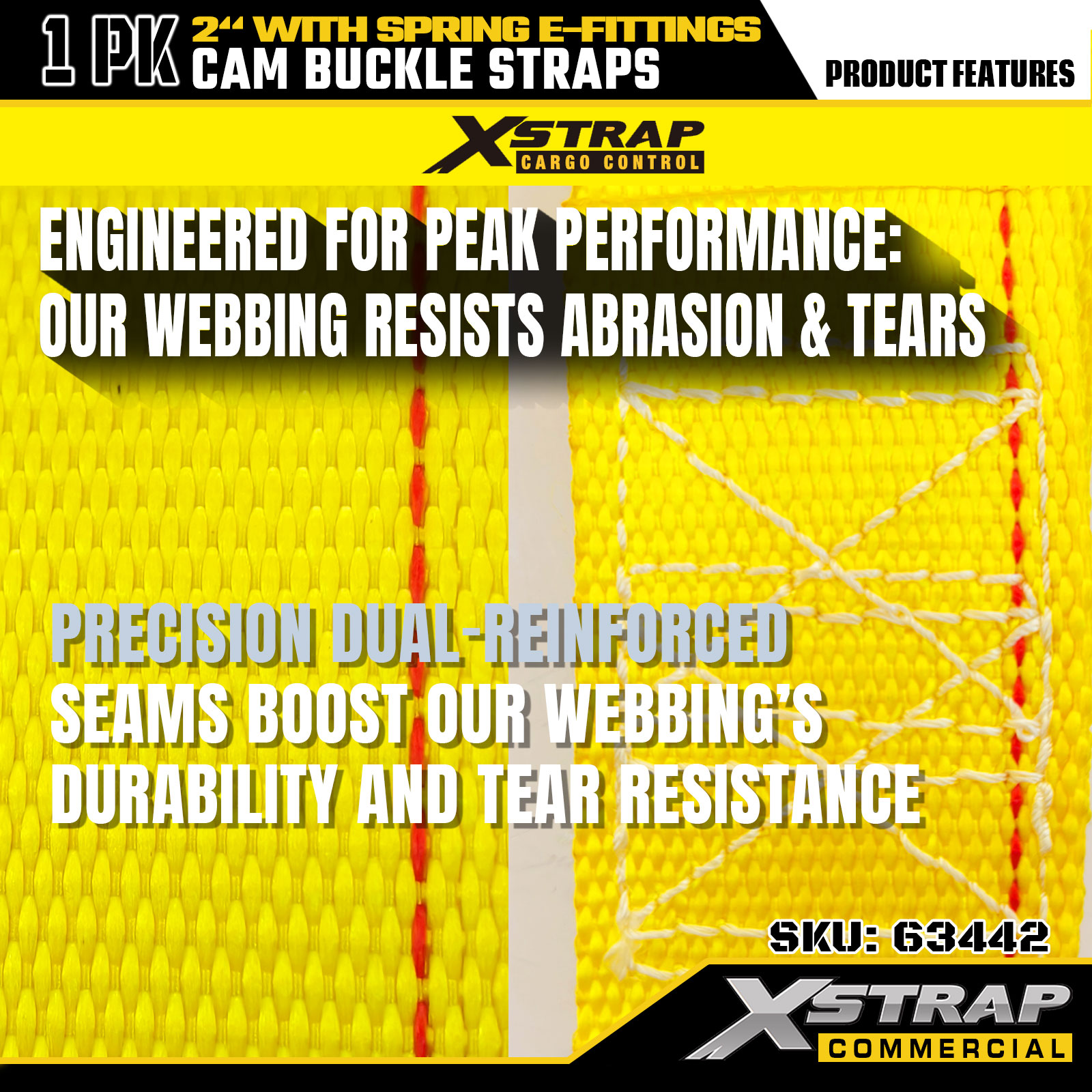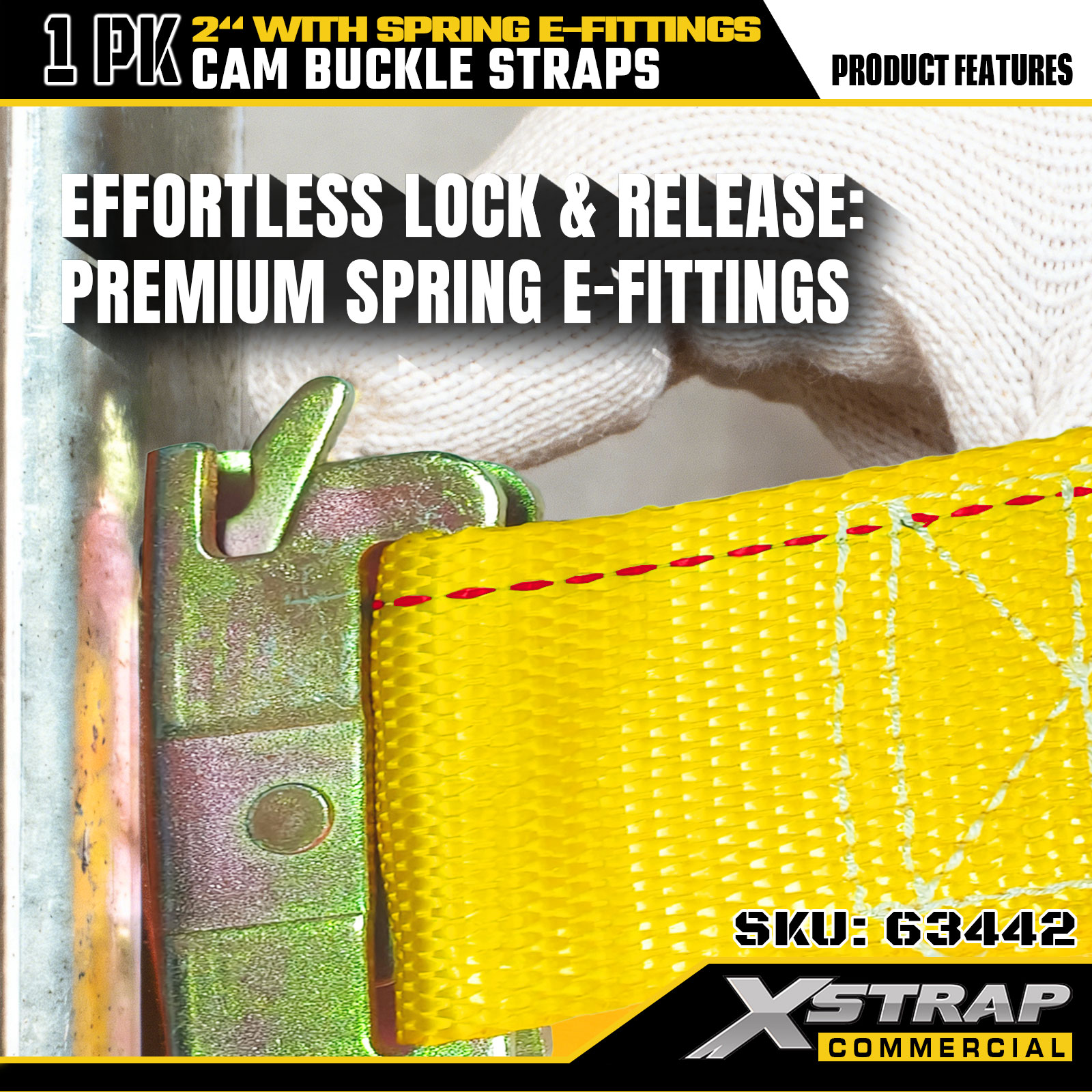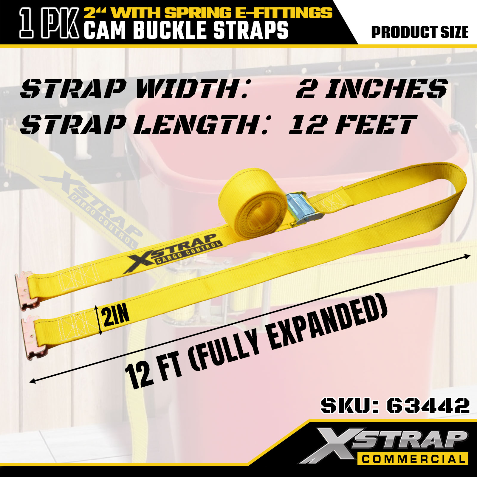 بند سگک بادامک سنگین Xstrap 63442 2 اینچ x 12 اینچ (1PK) - پلی استر زرد با اتصالات الکترونیکی فنری، 1000 پوند SWL و 453 پوند استحکام شکست برای جابجایی، کنترل بار و حمل و نقل