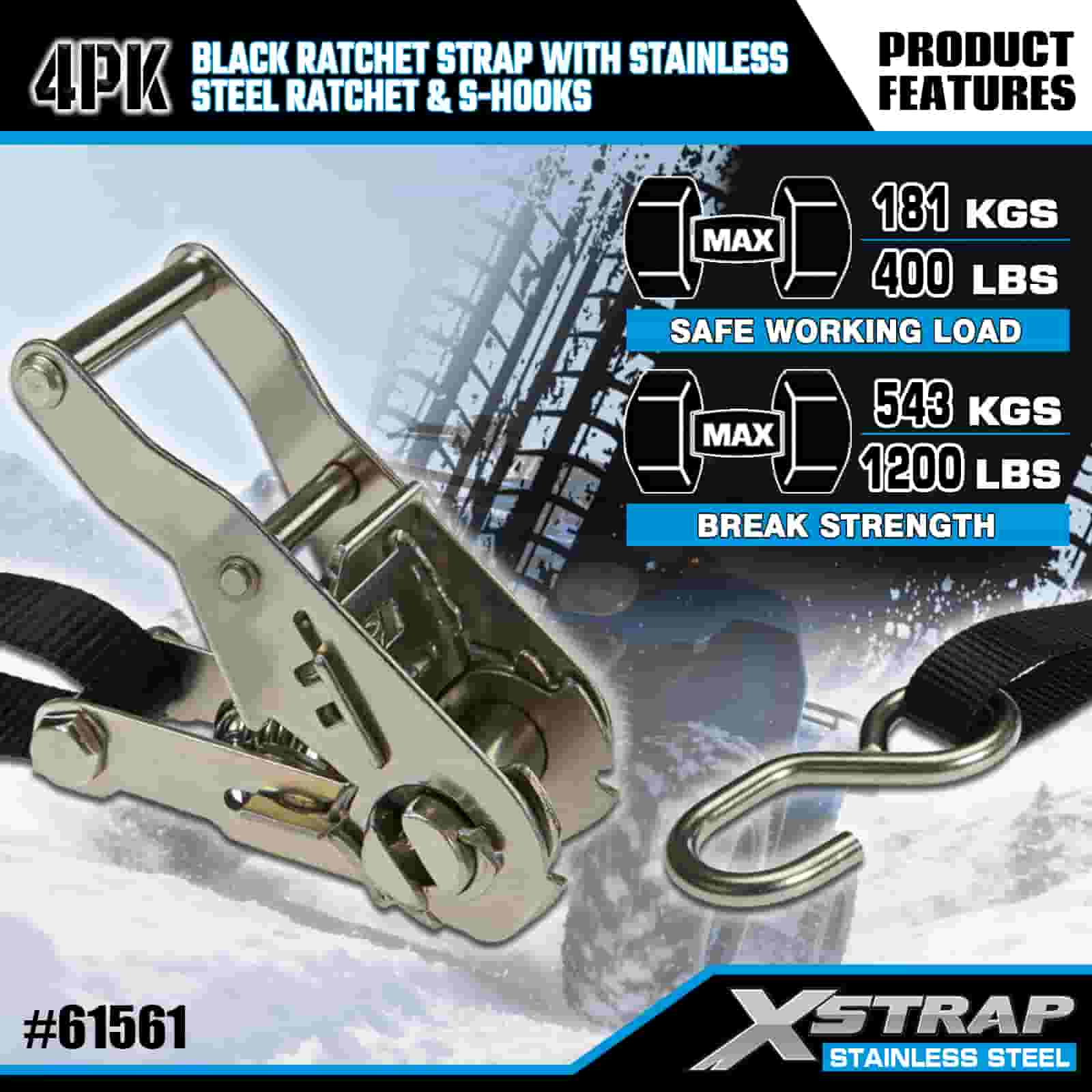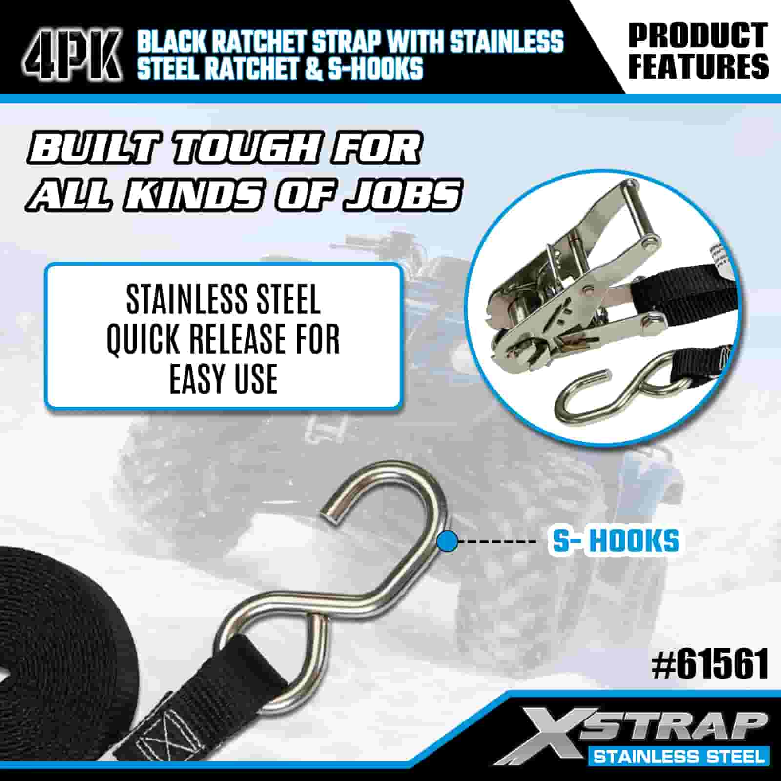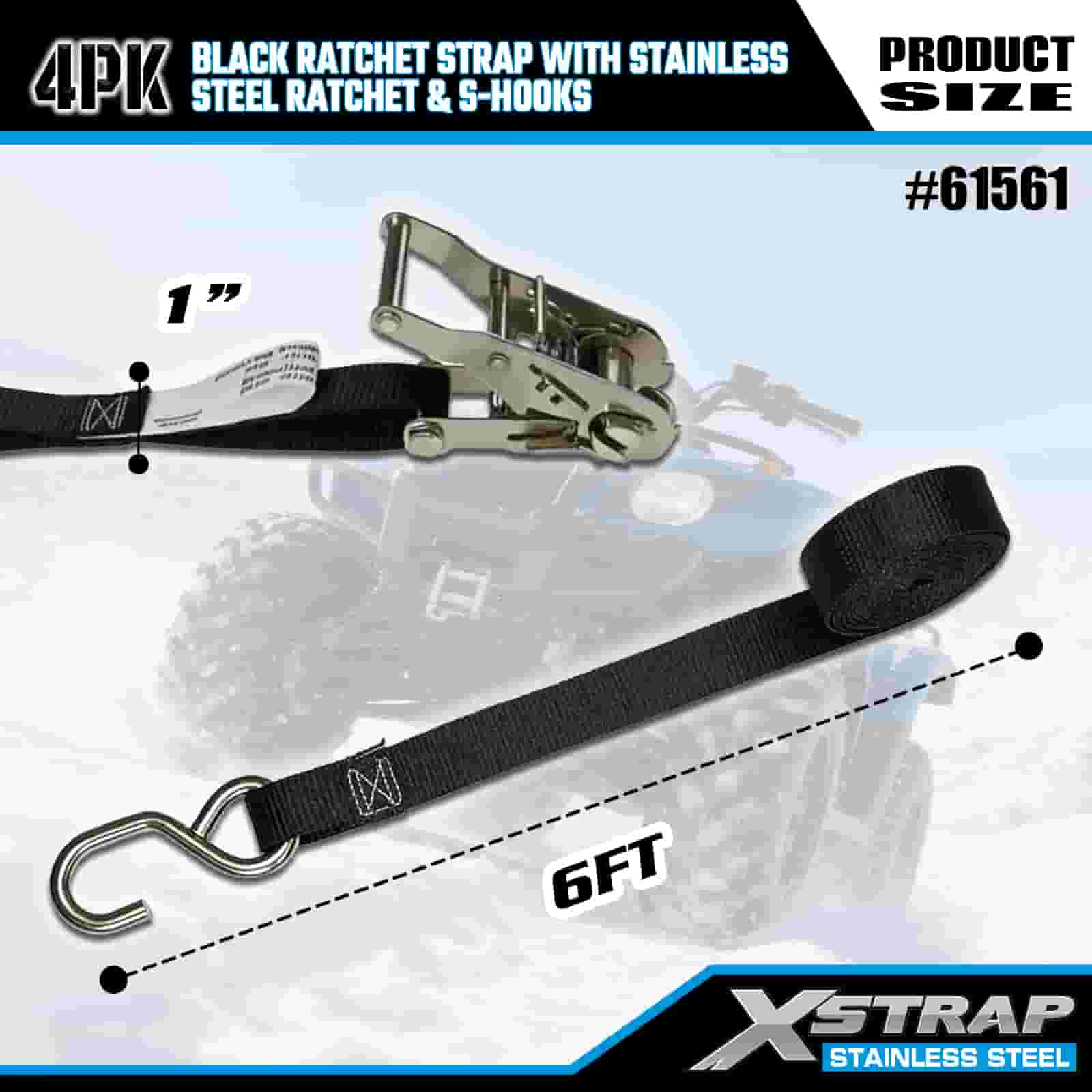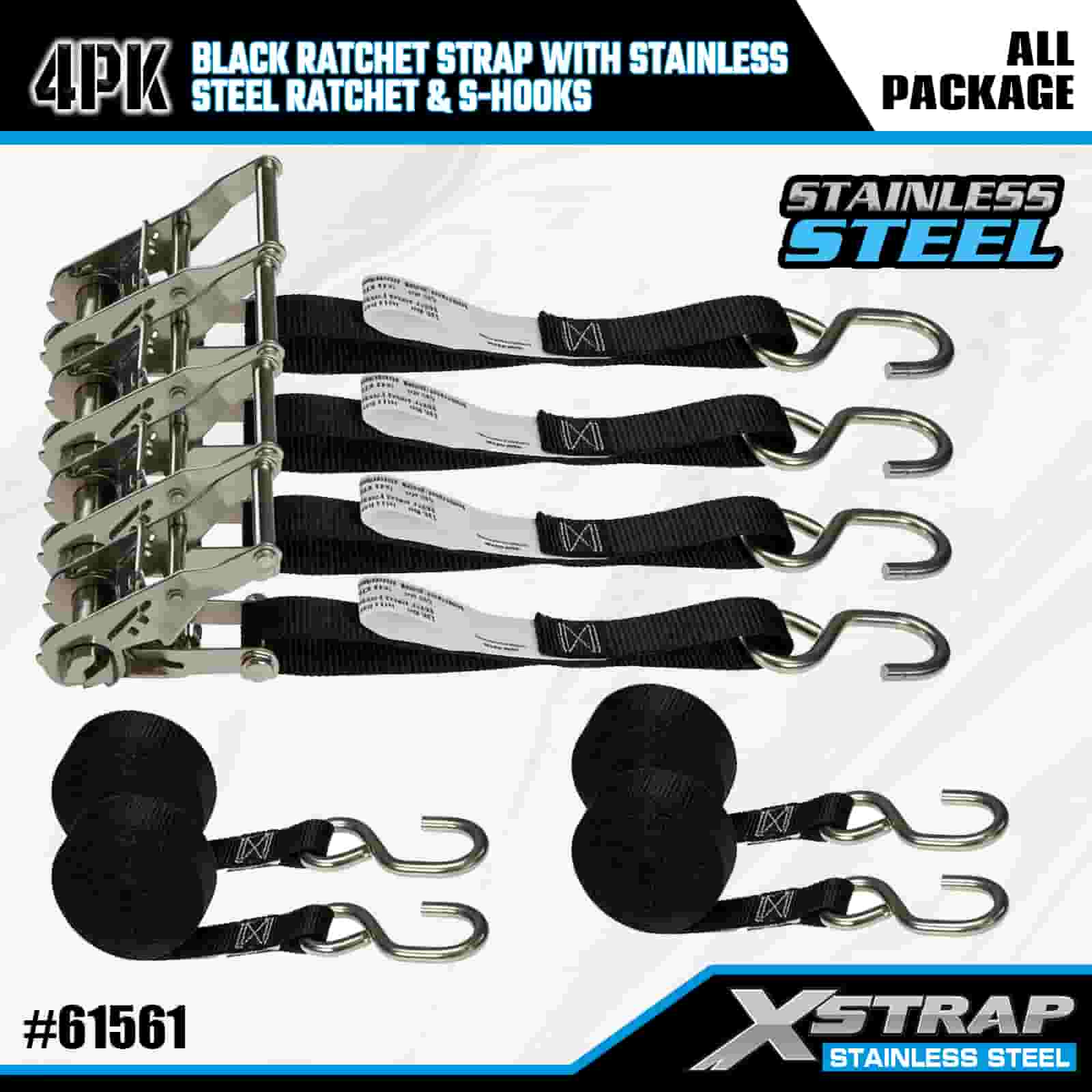 بند ضامن دار مشکی Xstrap 4PK با جغجغه ضامن دار و قلاب از جنس استنلس استیل، بند تسمه ضامن دار با بند پلی استر 1 اینچی × 6، تسمه های ایمن بندکشی باری با ظرفیت 400 پوند با قلاب های S برای تریلر، تریلر تخت تخت، قایق اسکی Carqui, Ementavyma.
