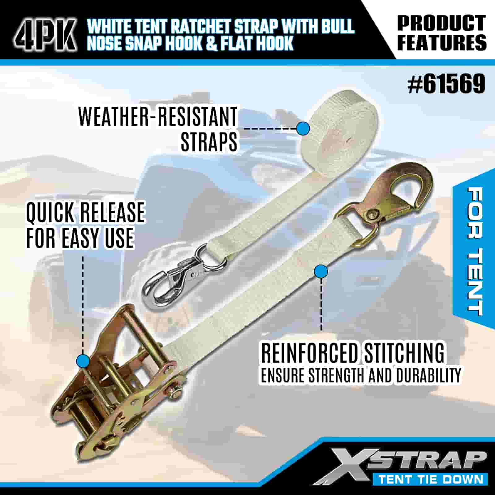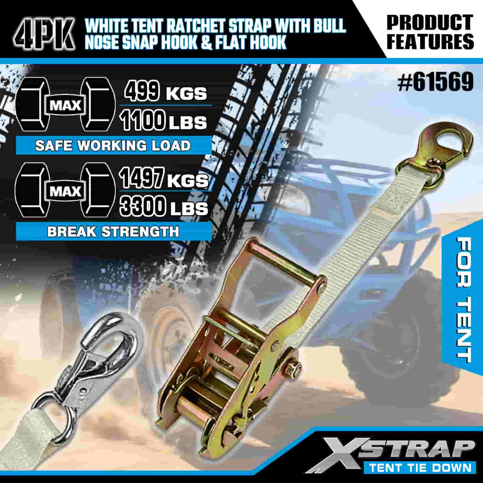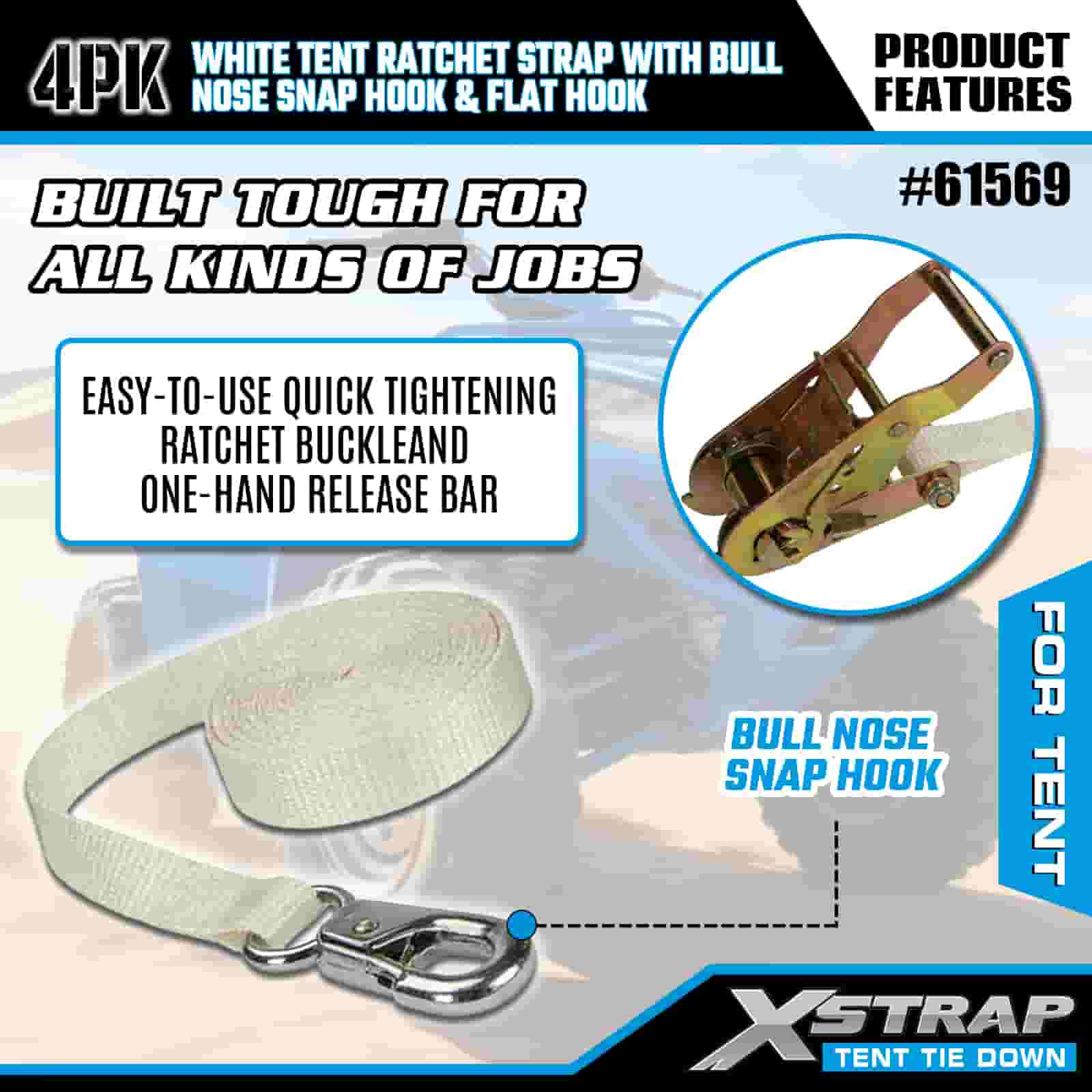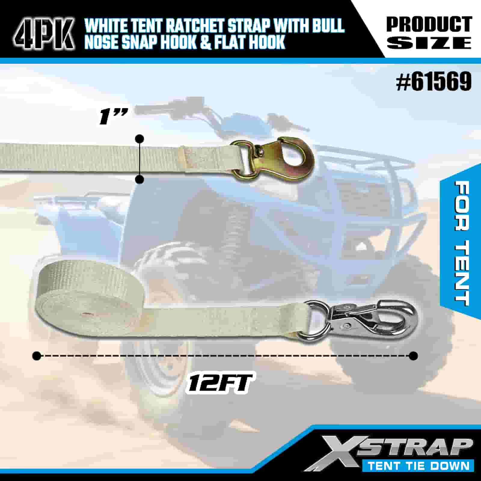 بند ضامن دار چادر سفید Xstrap 4PK با قلاب گیره دار بینی گاو و قلاب مسطح، بند تسمه ضامن دار با بند پلی استر 1 اینچ 12 اینچ، تسمه های محکم بندکشی بار با ظرفیت 1100 پوند با قلاب گیره دماغه و قلاب صاف برای کنترل بار، تثبیت چادر.