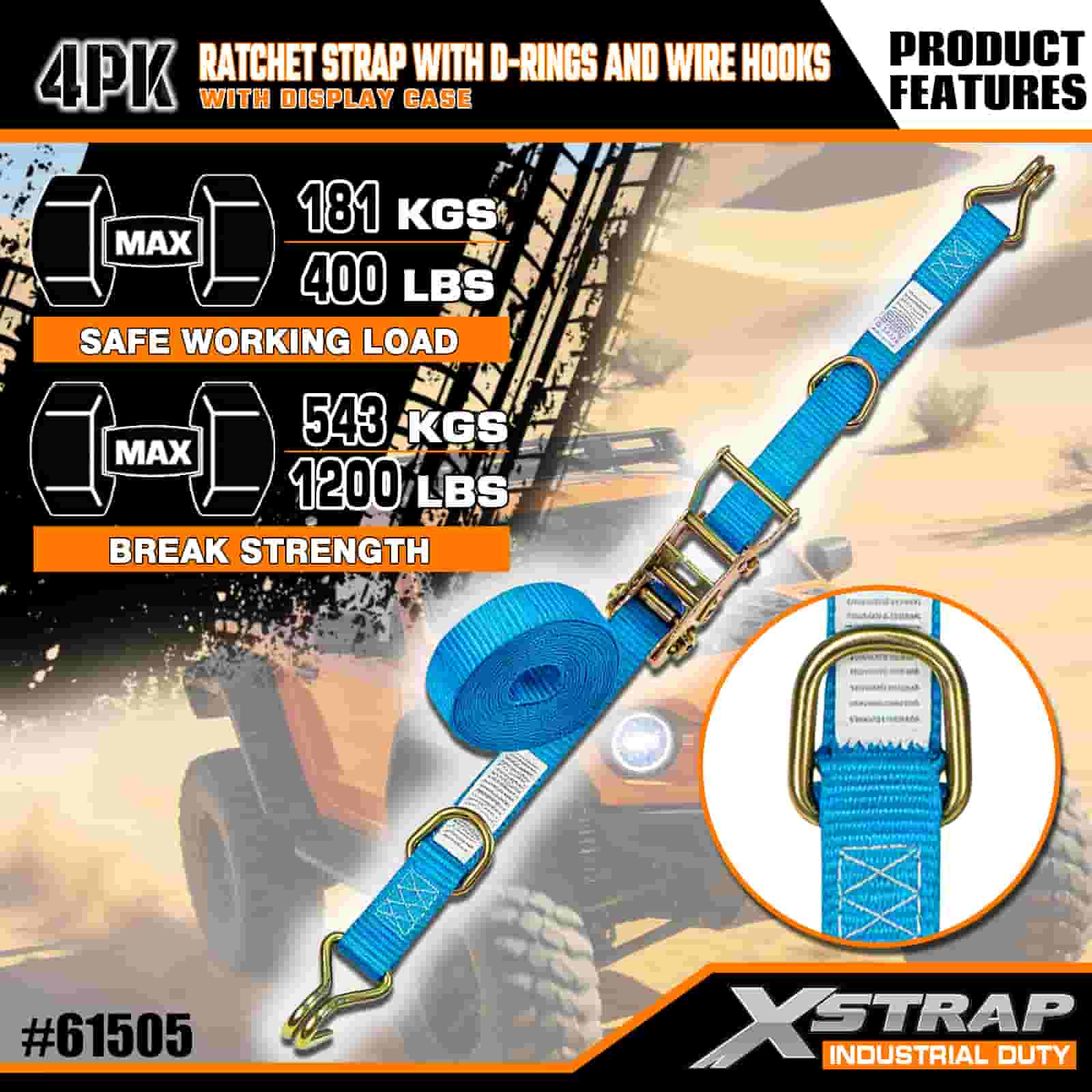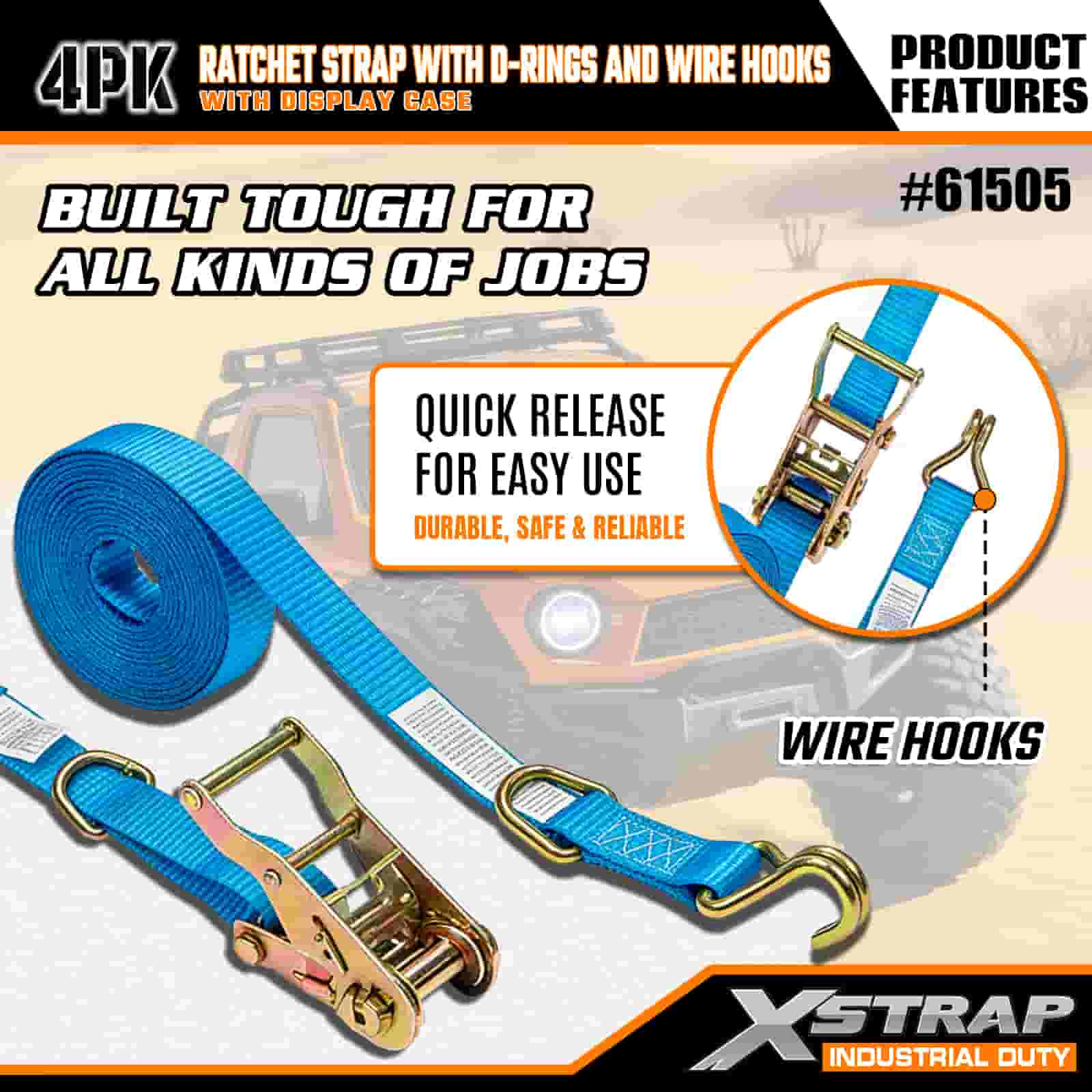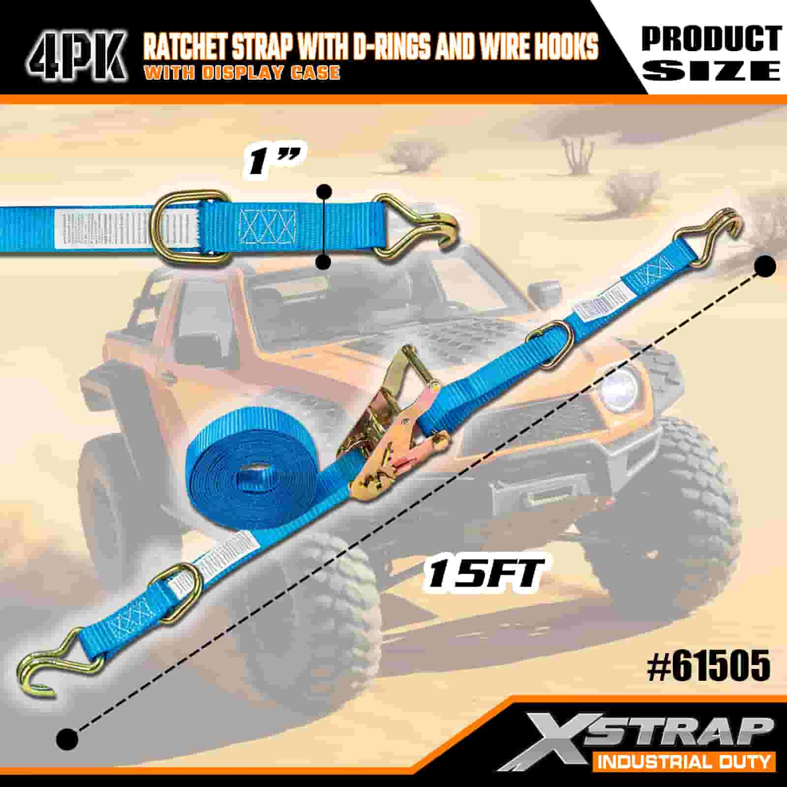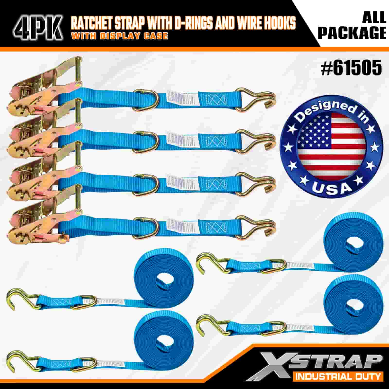 بند 4 بسته بادامک Xstrap با حلقه D-Ring و قلاب سیمی، بند بند ضامن دار کششی پلی استر 1 اینچی x 15 اینچ، تسمه های ایمن بندکشی باری با ظرفیت 400 پوندی با قلاب سیمی برای تریلر حرفه ای جدی تا ایمن تریلر باری، S,S.