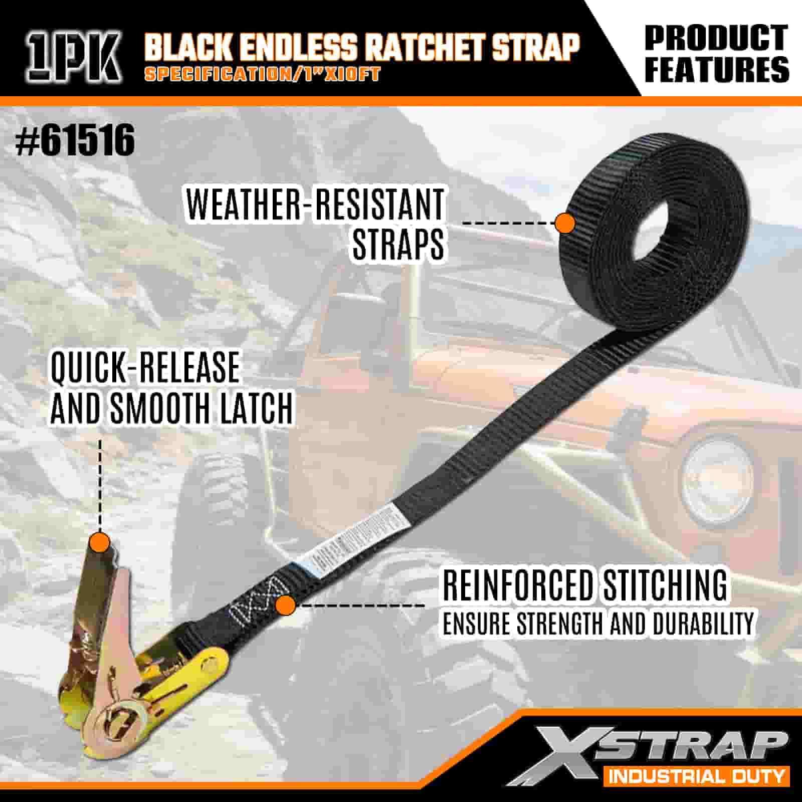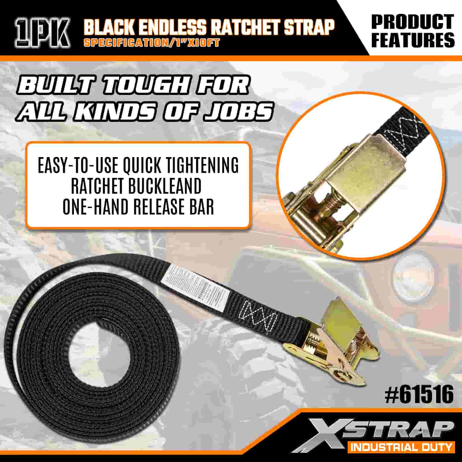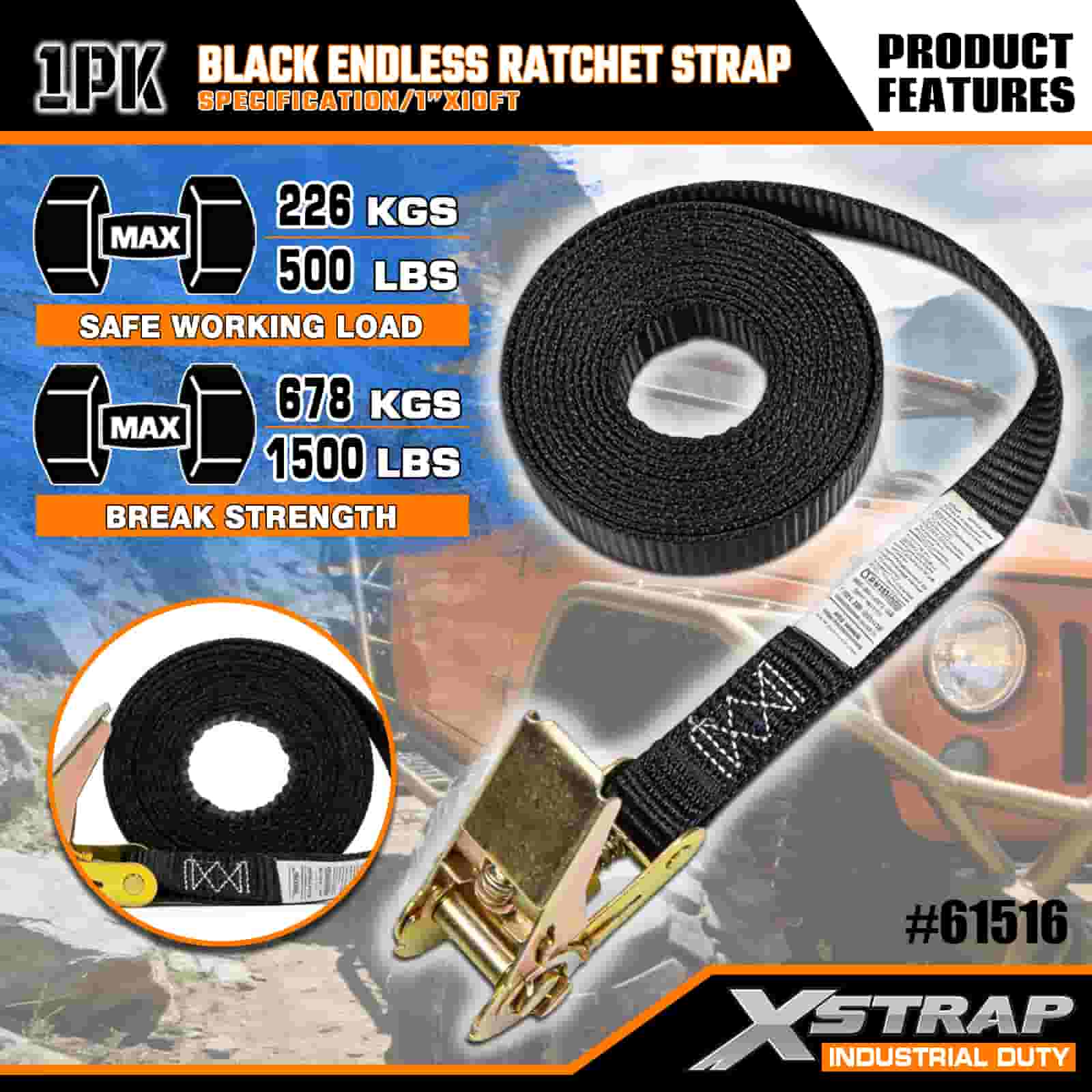 تسمه ضامن دار بی پایان مشکی Xstrap، بند تسمه ضامن دار بندکشی پلی استر 1 اینچی × 10 اینچی، تسمه های محکم بندکشی باری با ظرفیت 500 پوند برای تریلر باری ایمن حرفه ای، تریلر تخت تخت، قایق اسکی، ماشین کوچک.