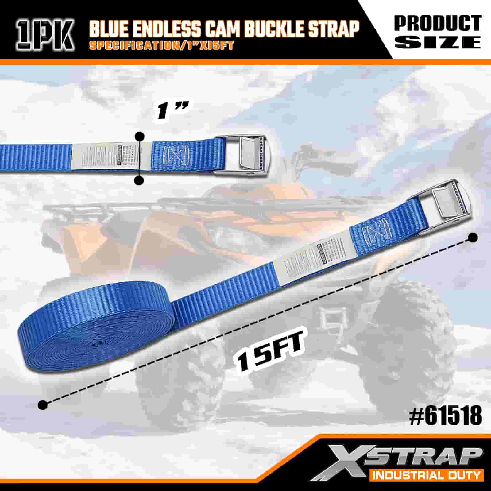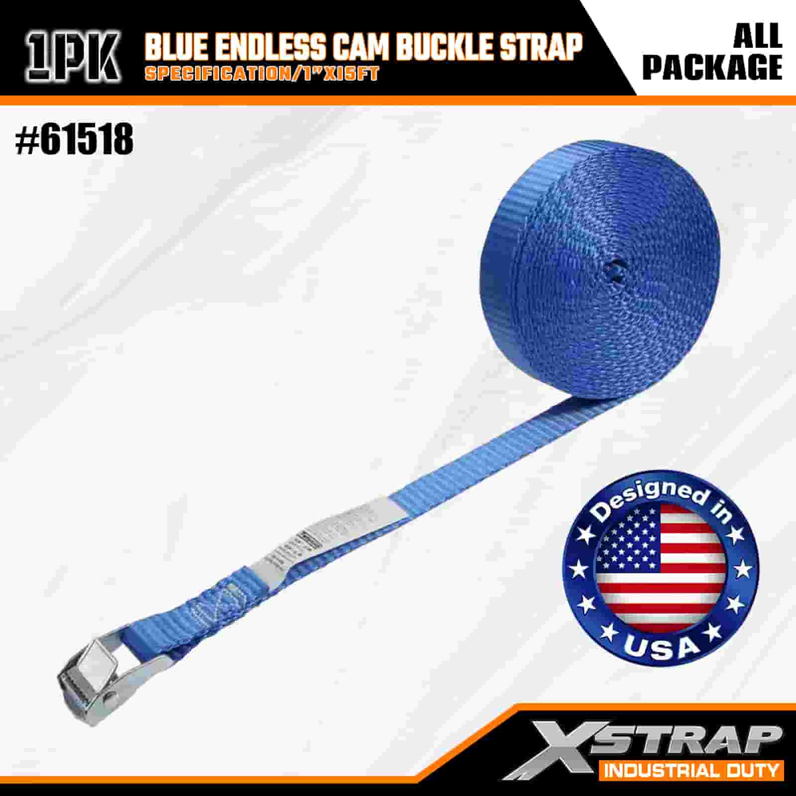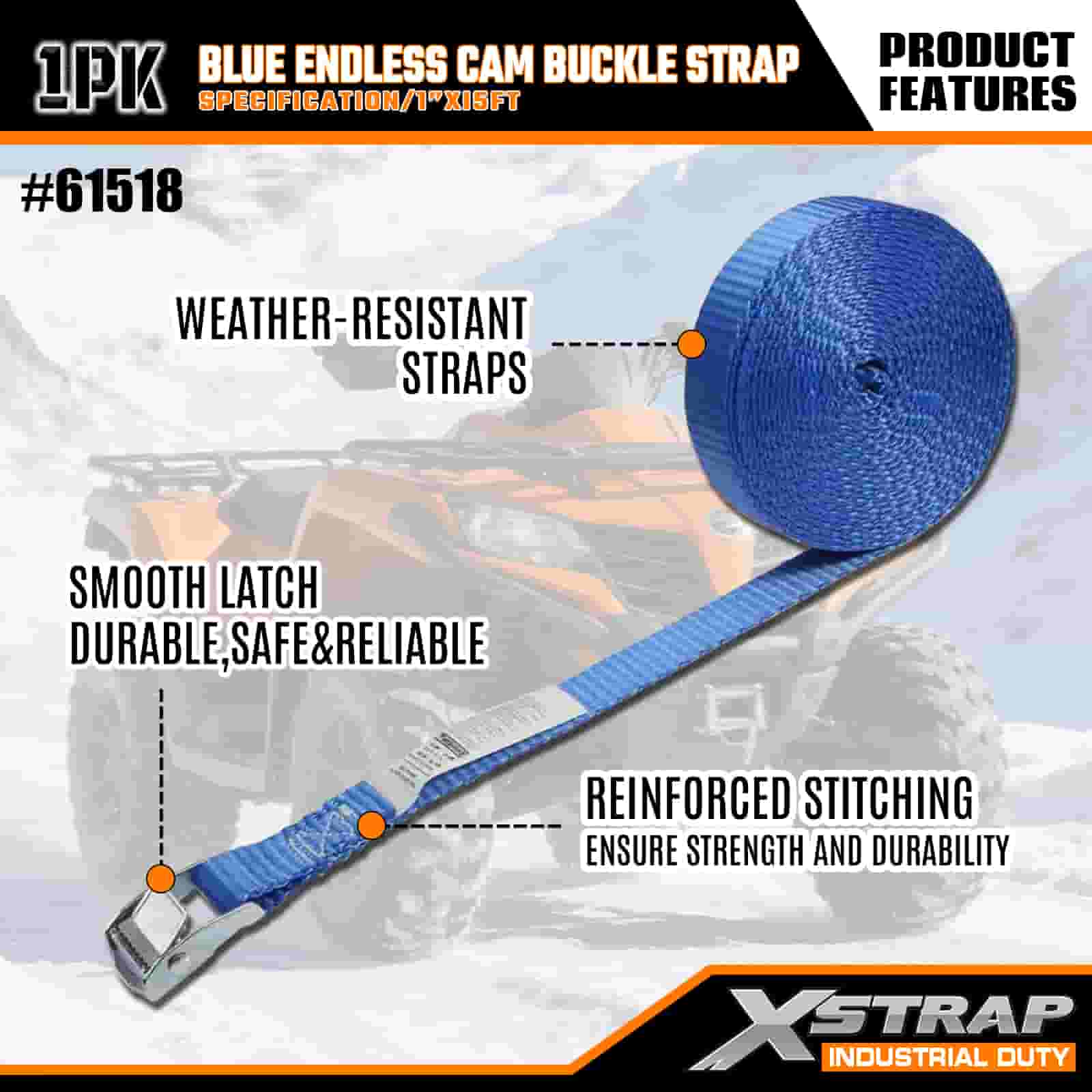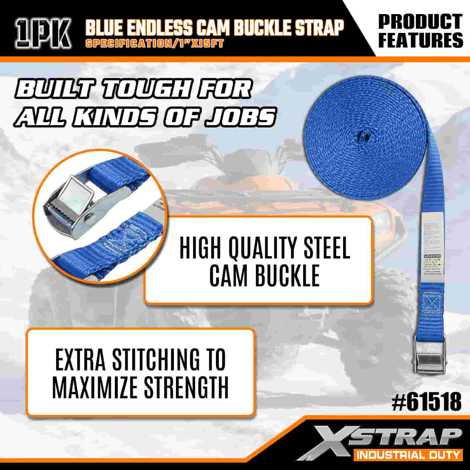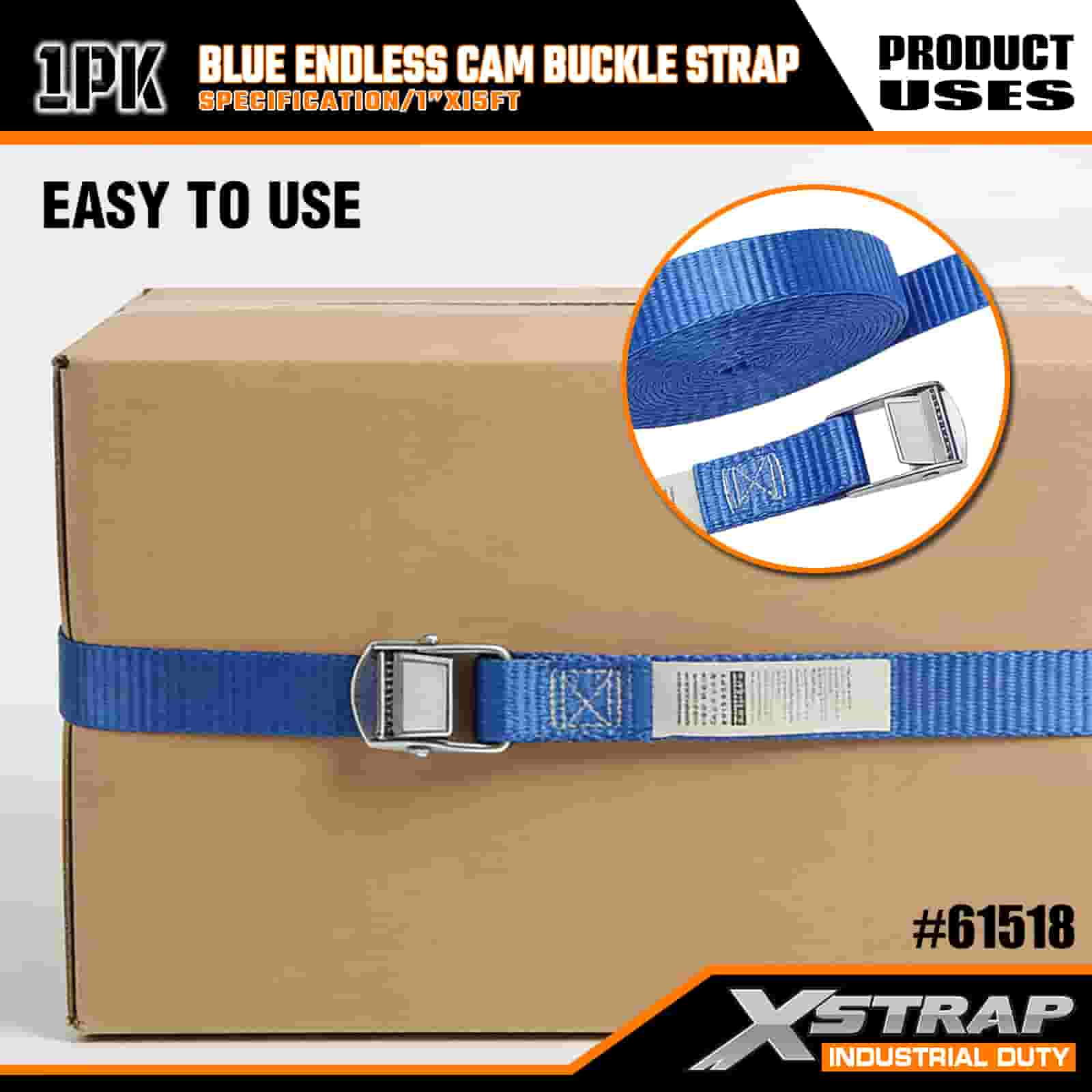 Xstrap بند سگک بادامک بیپایان آبی، بند بند ضامن دار کششی پلی استر 1 اینچی × 15 اینچی، تسمههای محکم بندکشی باری با ظرفیت 166 پوند برای تریلر محموله، تریلر تخت تخت، قایق اسکی، ماشین کوچک.