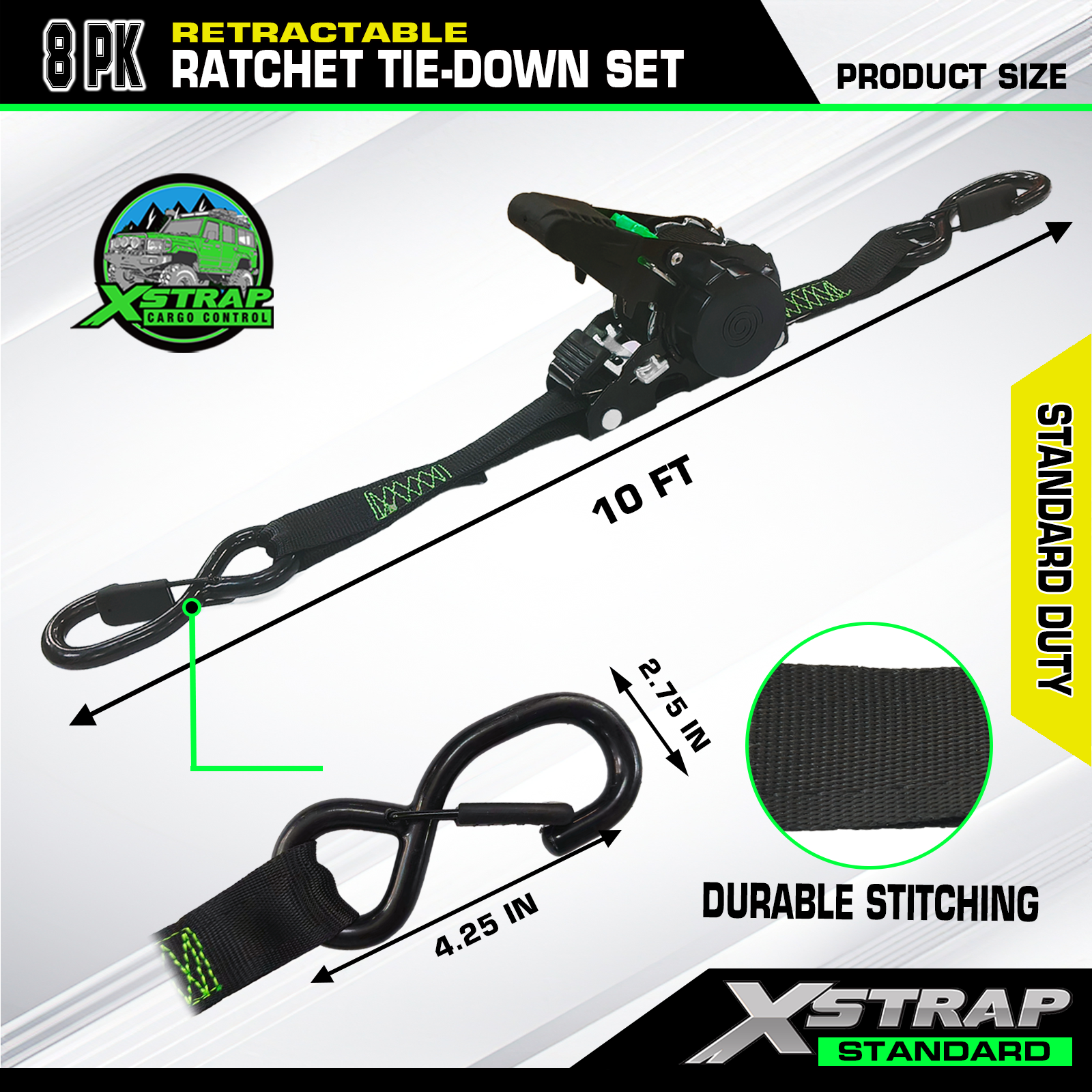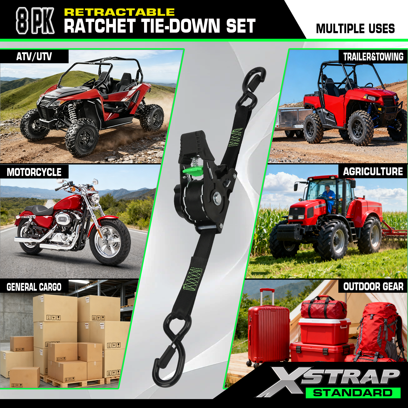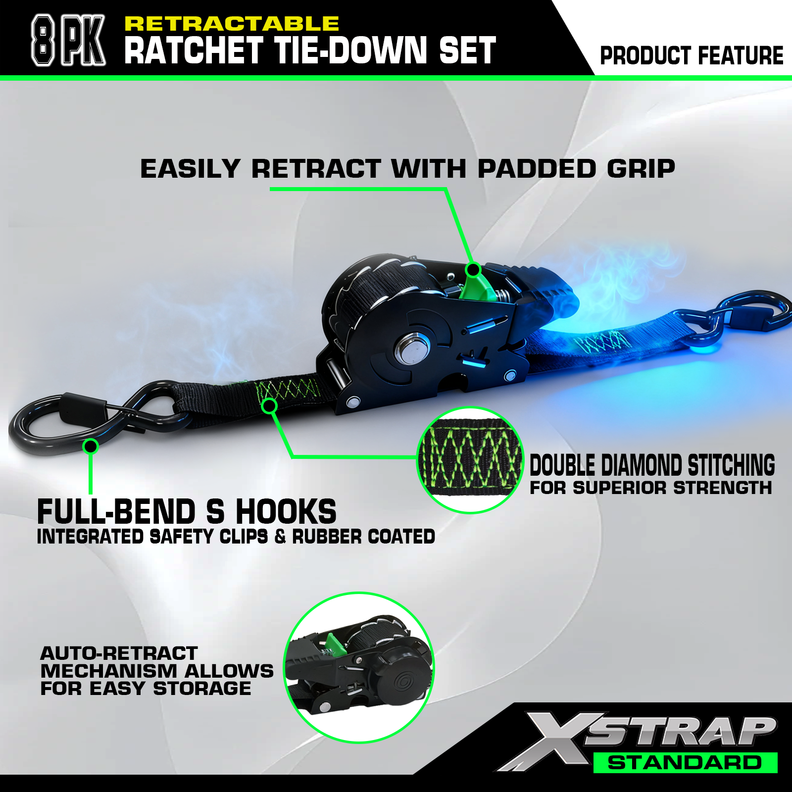 بند ضامن دار جمع شونده دارای مکانیزم جمع شدن خودکار داخلی است که به بند اجازه می دهد پس از استفاده به آرامی به داخل محفظه خود جمع شود. این نه تنها بند را تمیز و محافظت می کند، بلکه زمان آماده سازی و تمیز کردن را نیز به میزان قابل توجهی کاهش می دهد. نوار پلی استر 10 فوتی کشش قوی و استحکام قابل اعتمادی را برای موتورسیکلت ها، ATV ها، دوچرخه ها، UTV ها فراهم می کند. دسته جغجغه ارگونومیک برای کار راحت است و در هنگام سفت کردن بار، چسبندگی بهتر و تلاش کمتری را ارائه می دهد.