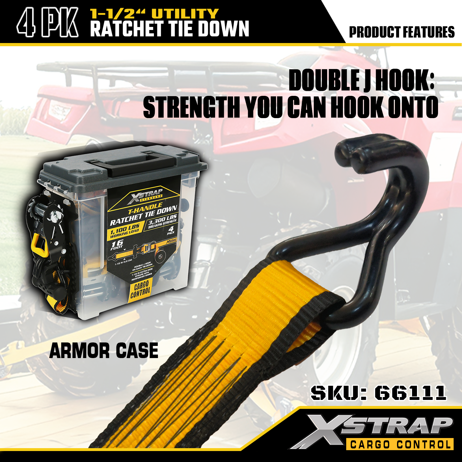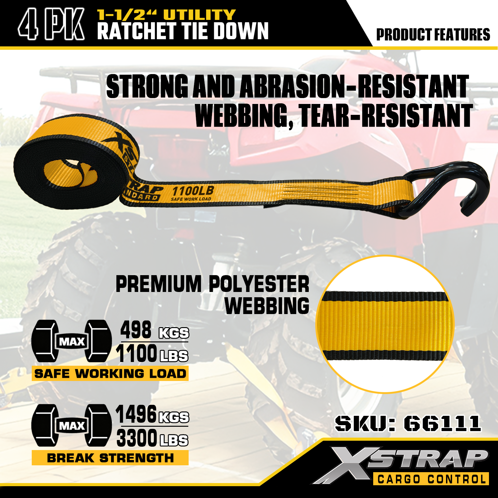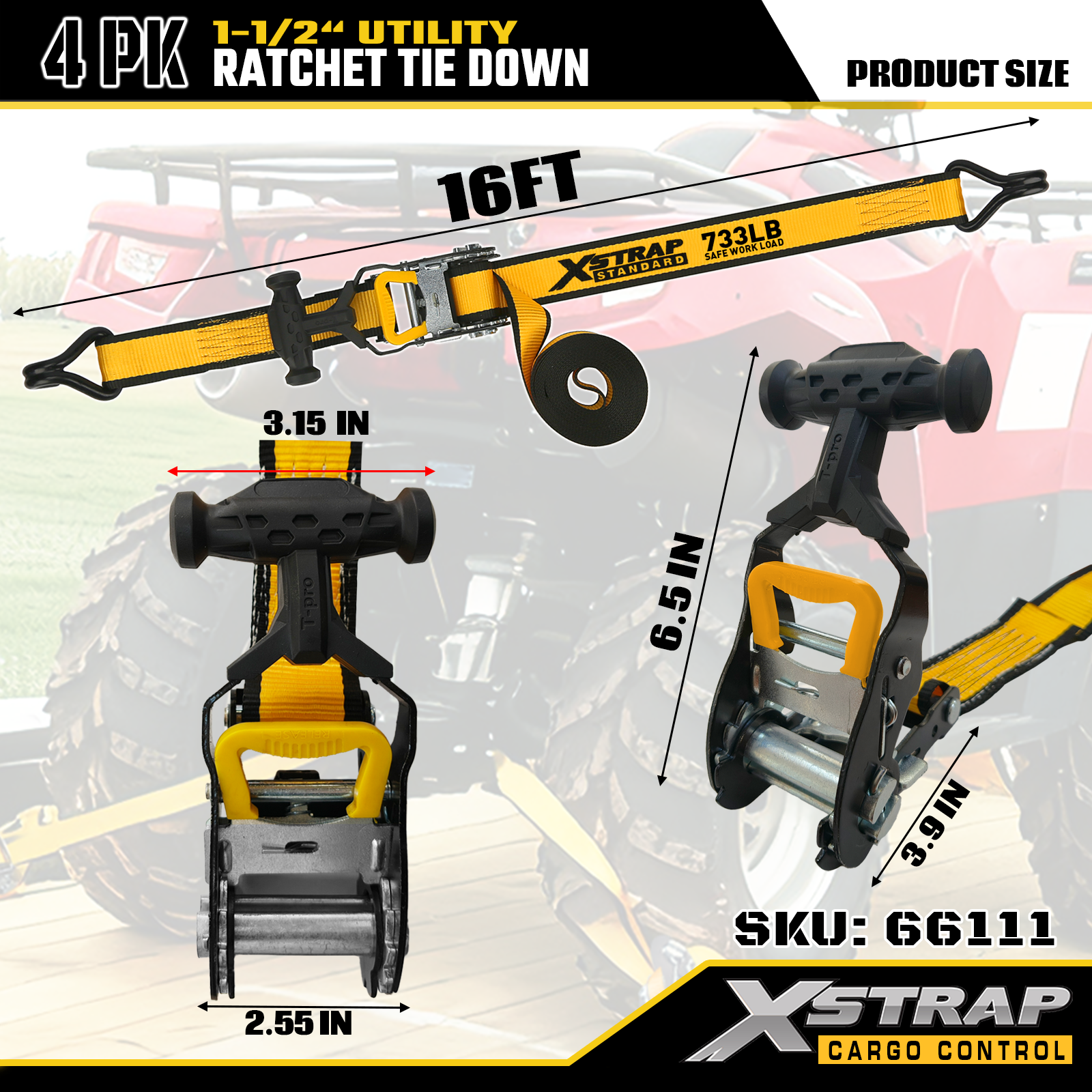 Xstrap T-Handle Ratchet Tie Down 1.5 اینچ x 16 فوت، بار کاری ایمن 1100 پوند و قدرت شکستن 3300 پوند است.