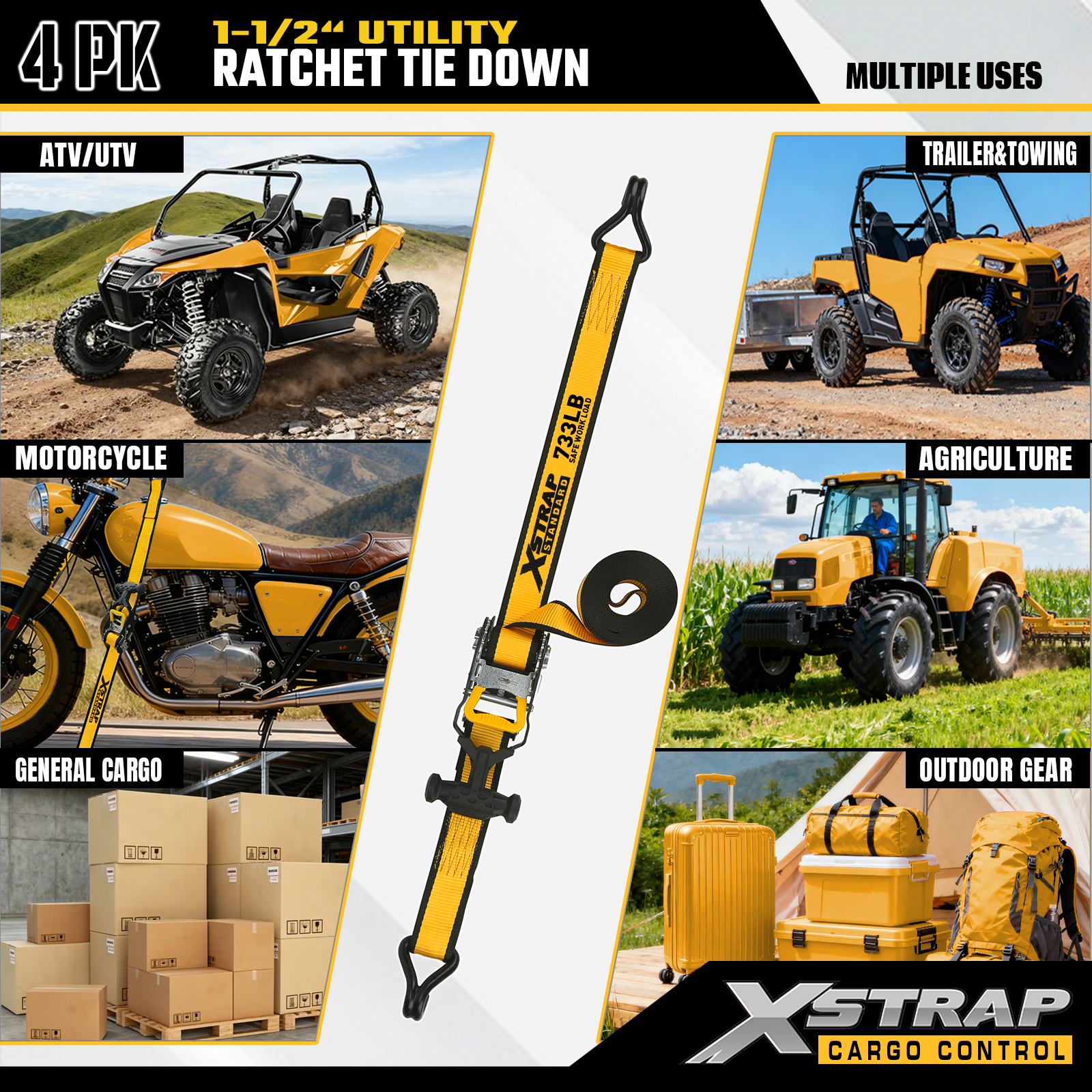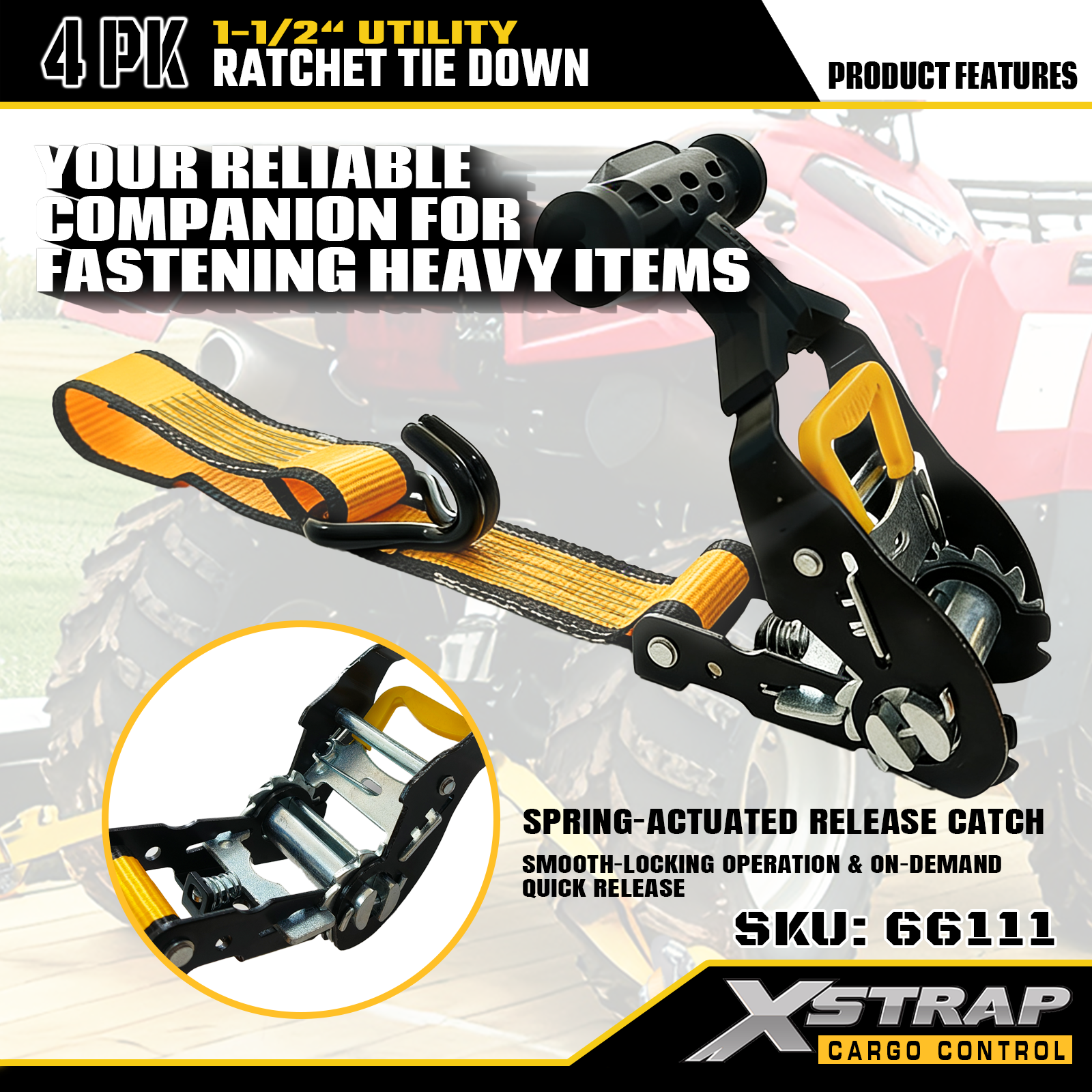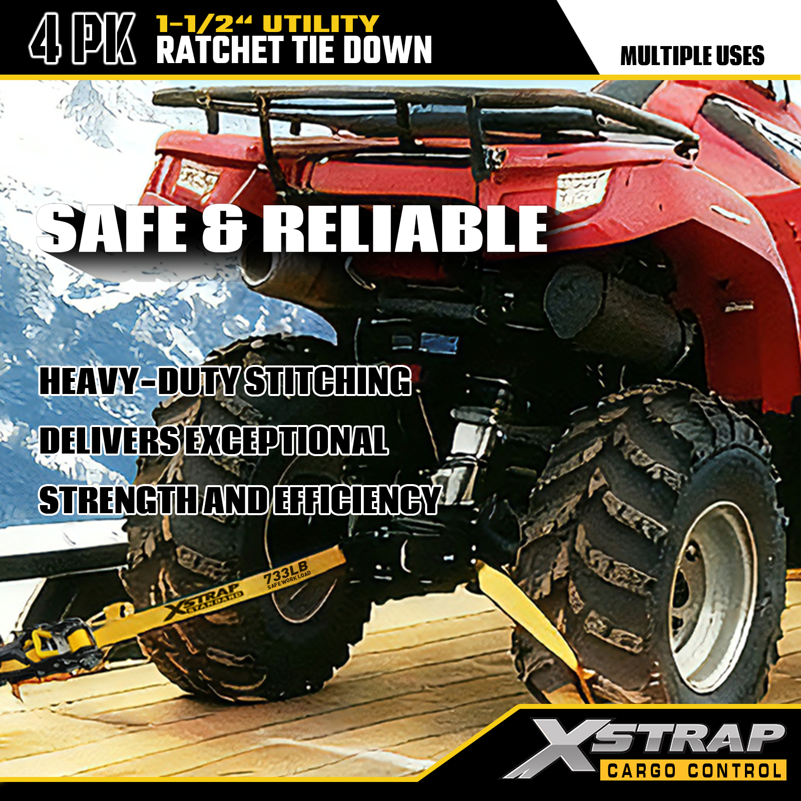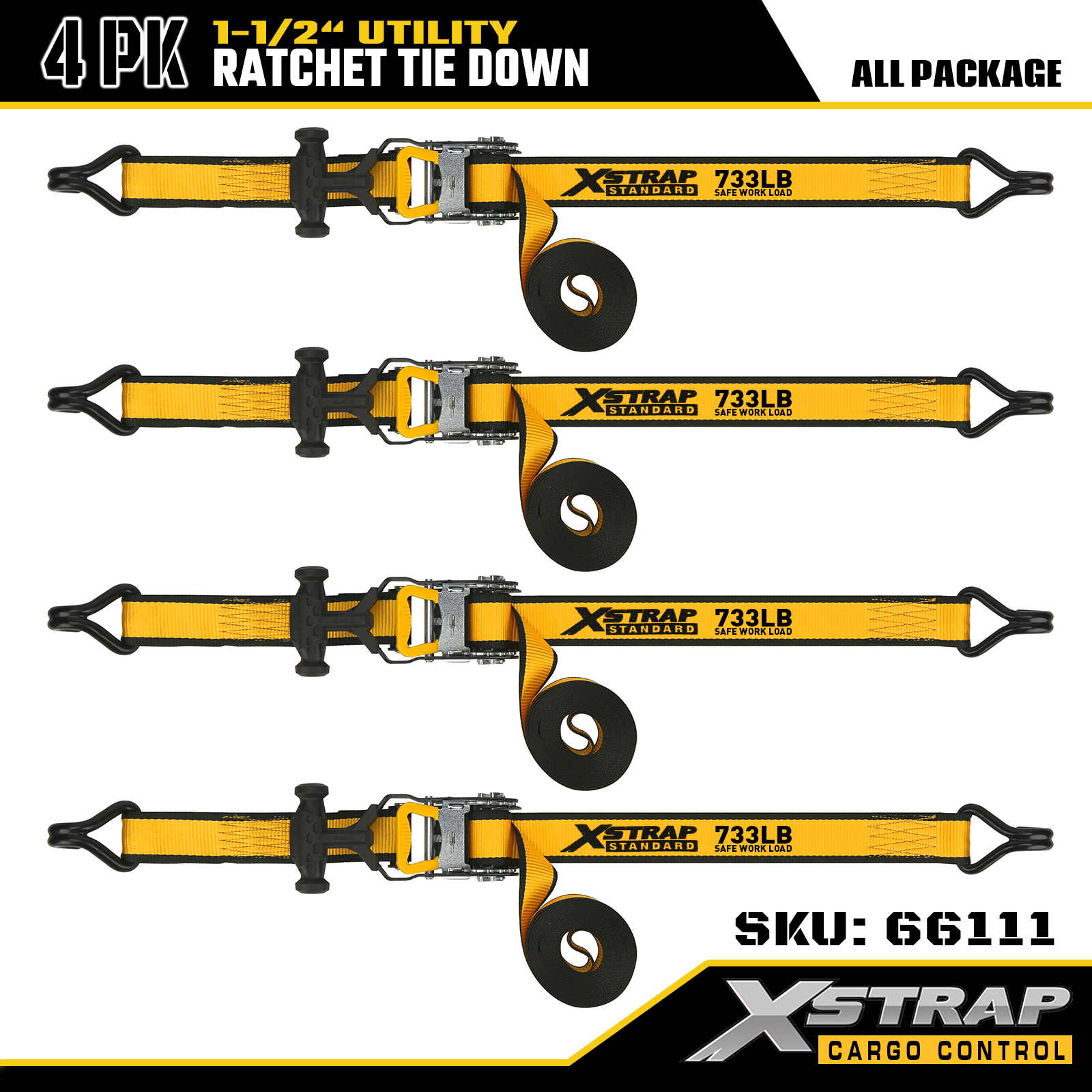 Xstrap T-Handle Ratchet Tie Down 1.5 اینچ x 16 فوت، بار کاری ایمن 1100 پوند و قدرت شکستن 3300 پوند است.