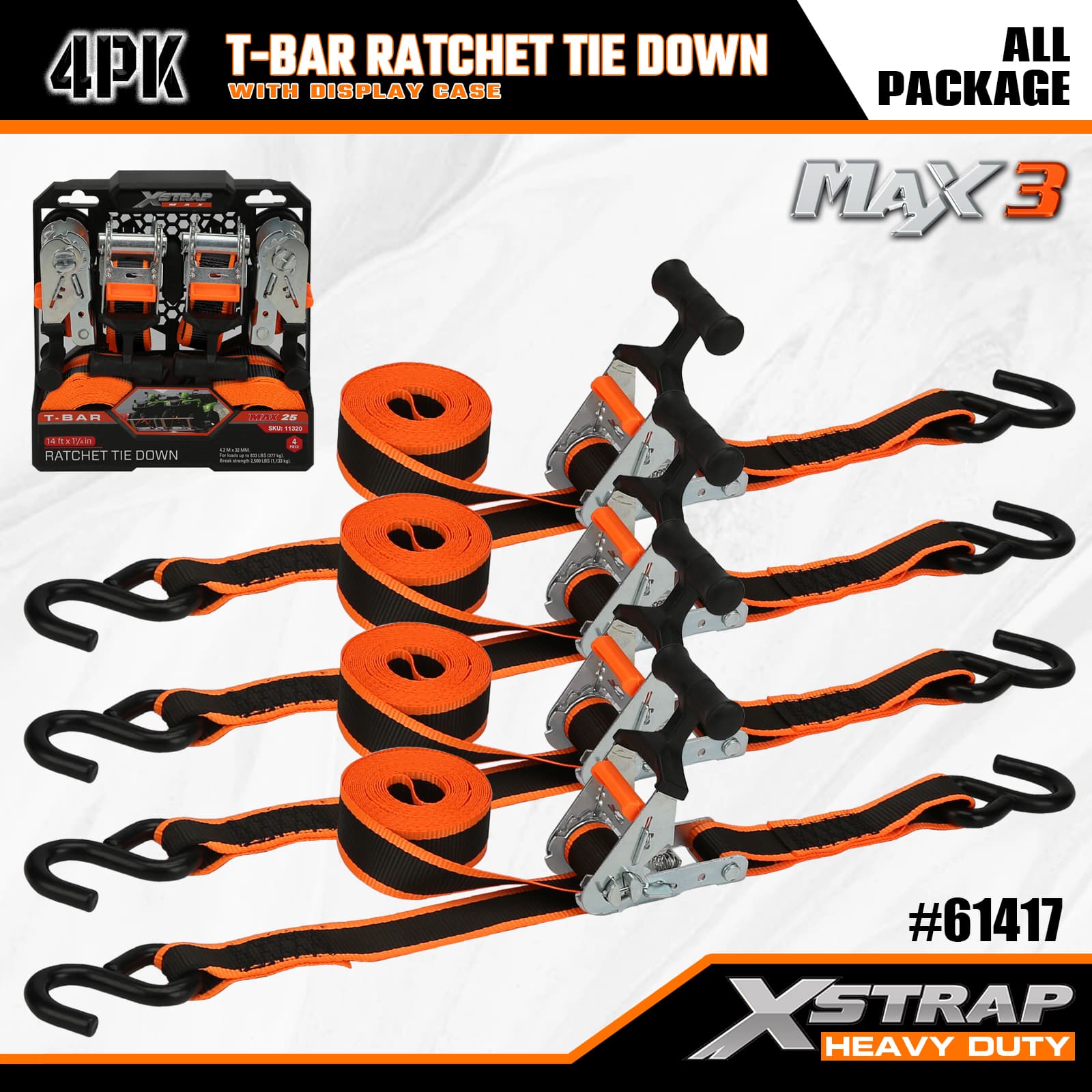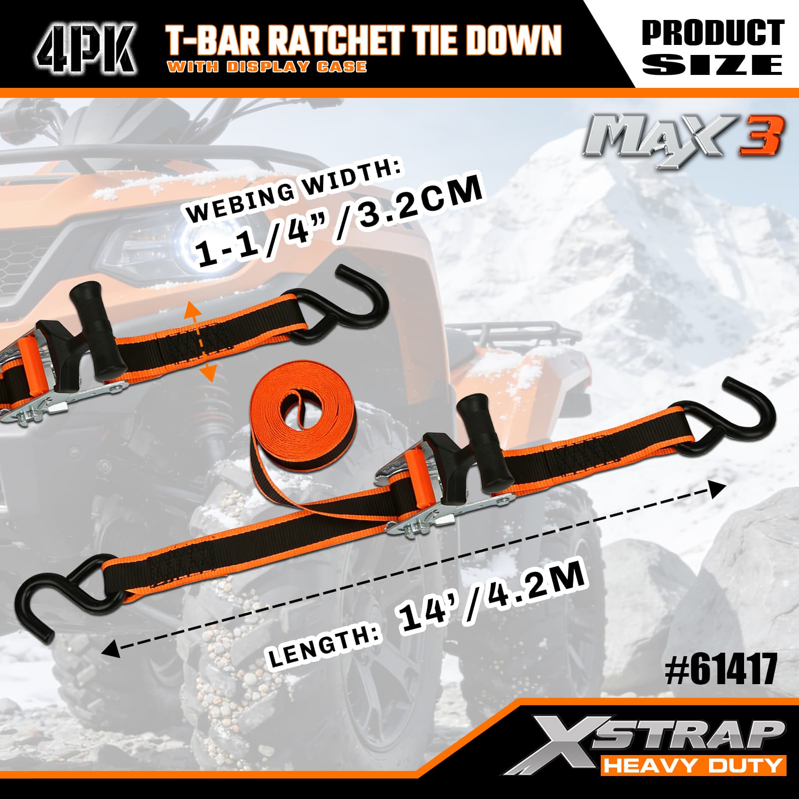 Xstrap 4 Pack T-Max Grip Ratchet Te Down, 1-1/4 x 14' Polyester Tie Down Rap Ratchet S strap, ظرفیت 1000lbs تسمه های ایمن بندکشی محموله با قلاب S برای پیکاپ کامیون، شاسی بلند، اتومبیل سواری سبک، موتورسیکلت سواری سبک تراکتور چمن.
