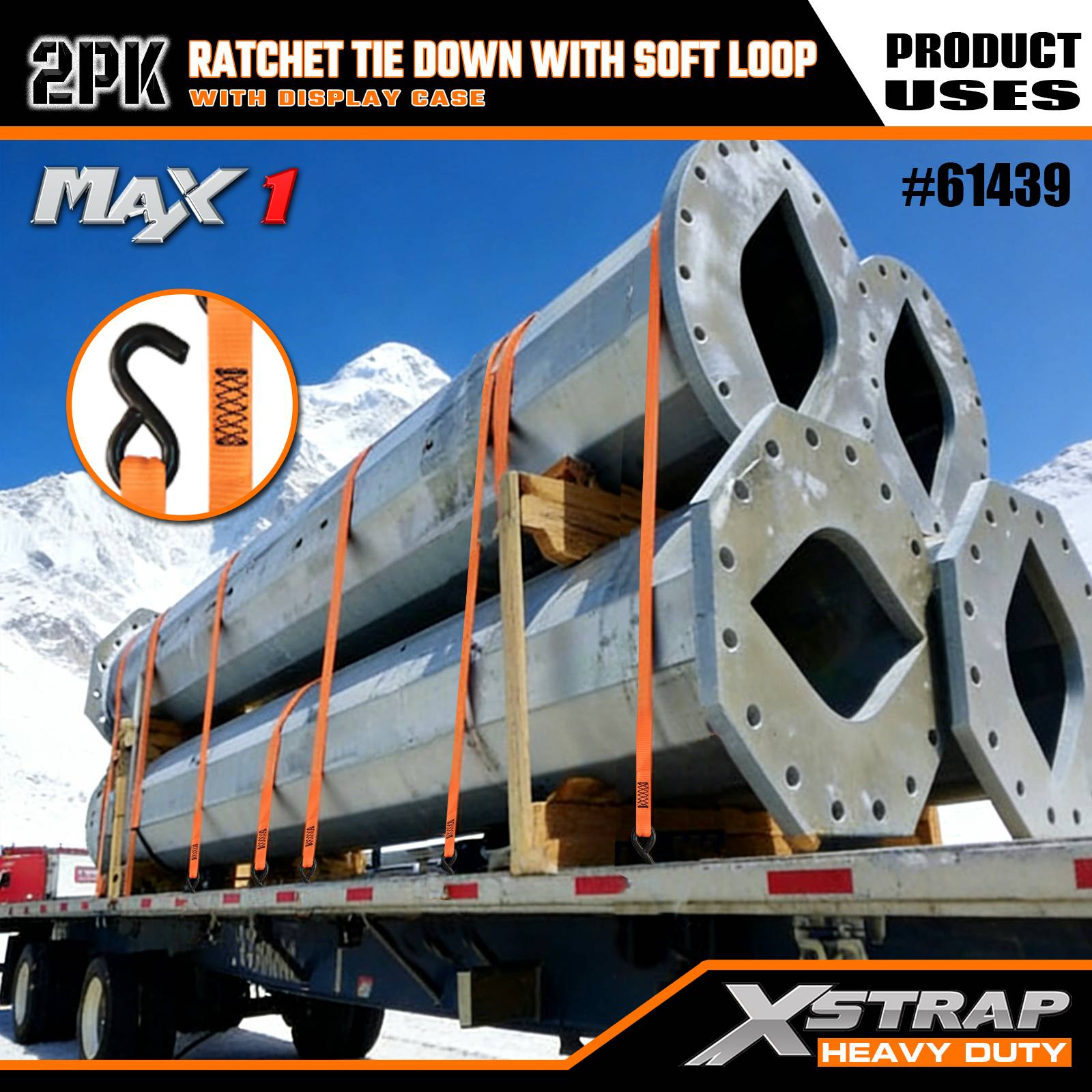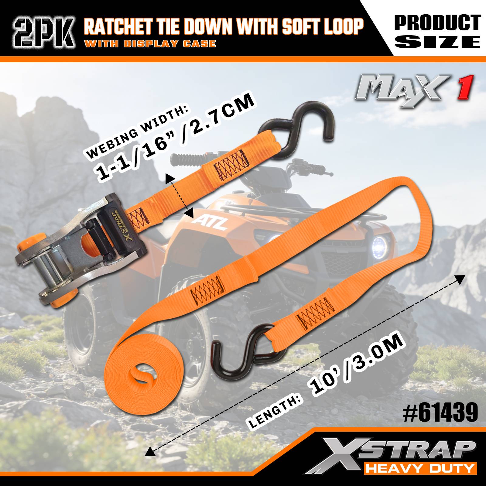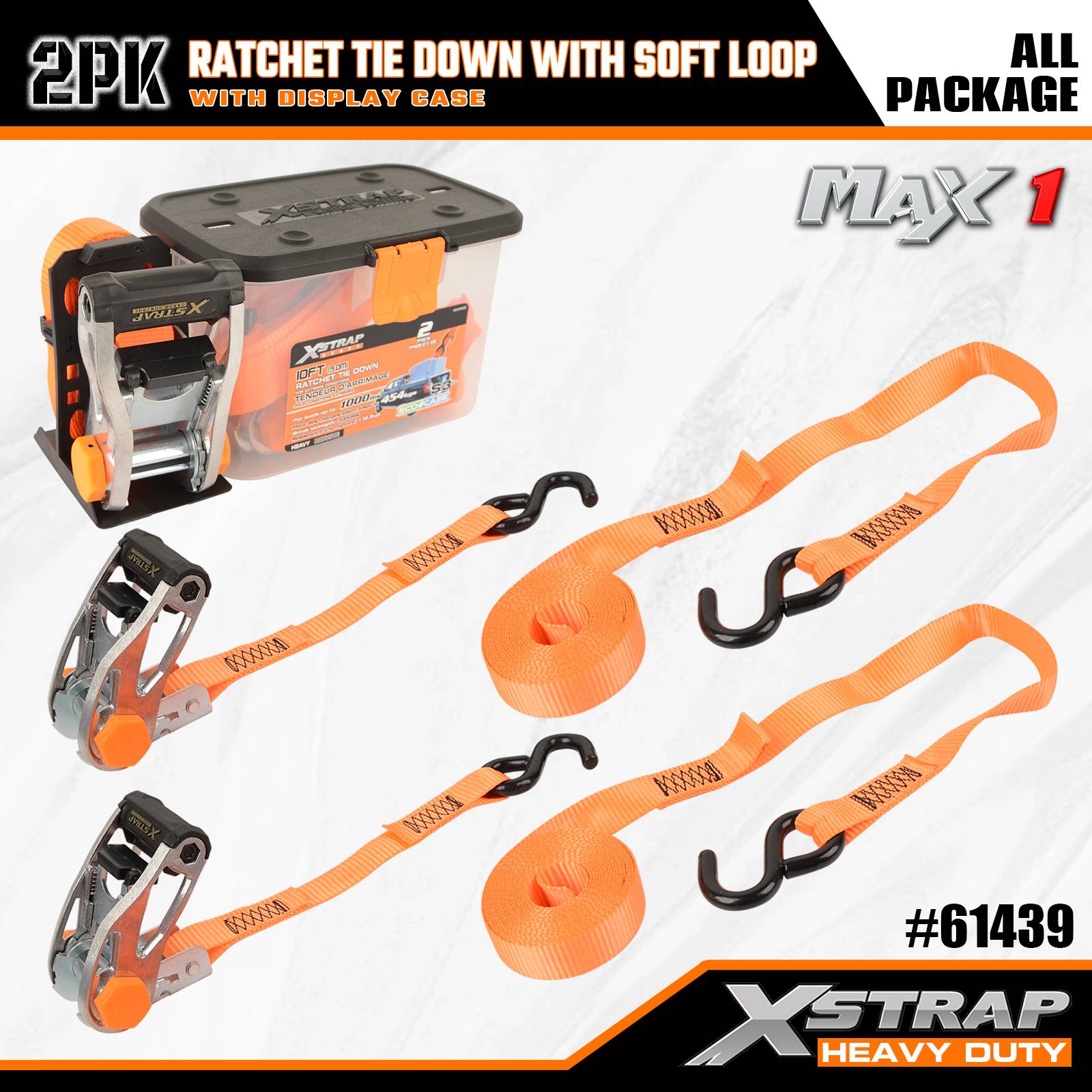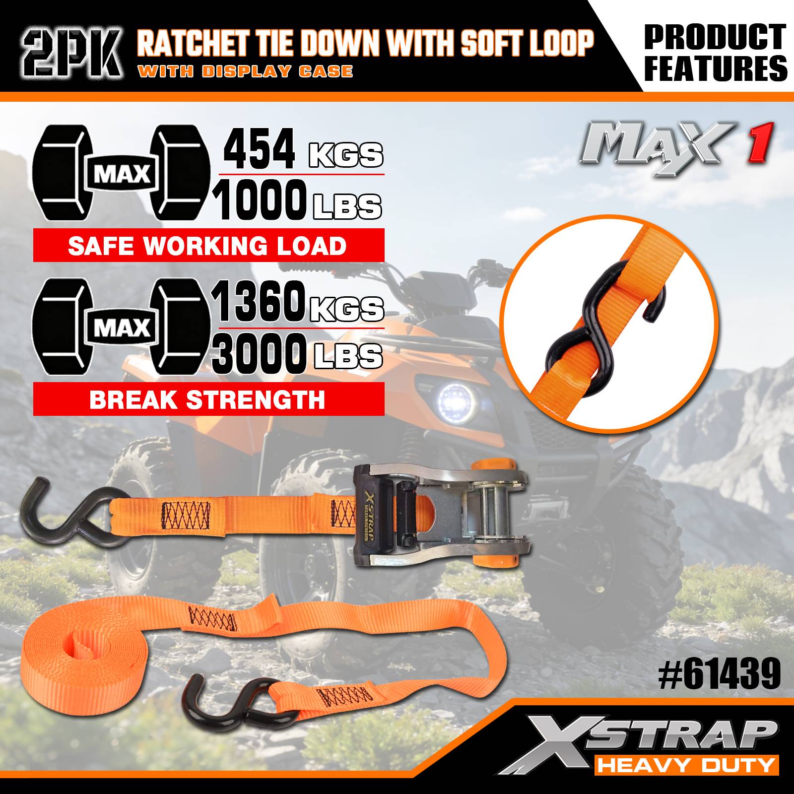 Xstrap 2 Pack Ratchet با حلقه نرم، 1-1/16 اینچ × 10 اینچ بند بند ضامن دار پلی استر، تسمه های محکم بند باری با ظرفیت 1000 پوند با قلاب S برای کامیون، SUV، موتور سیکلت تاپ رک.