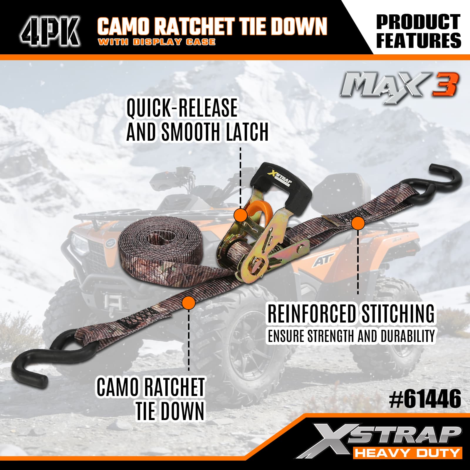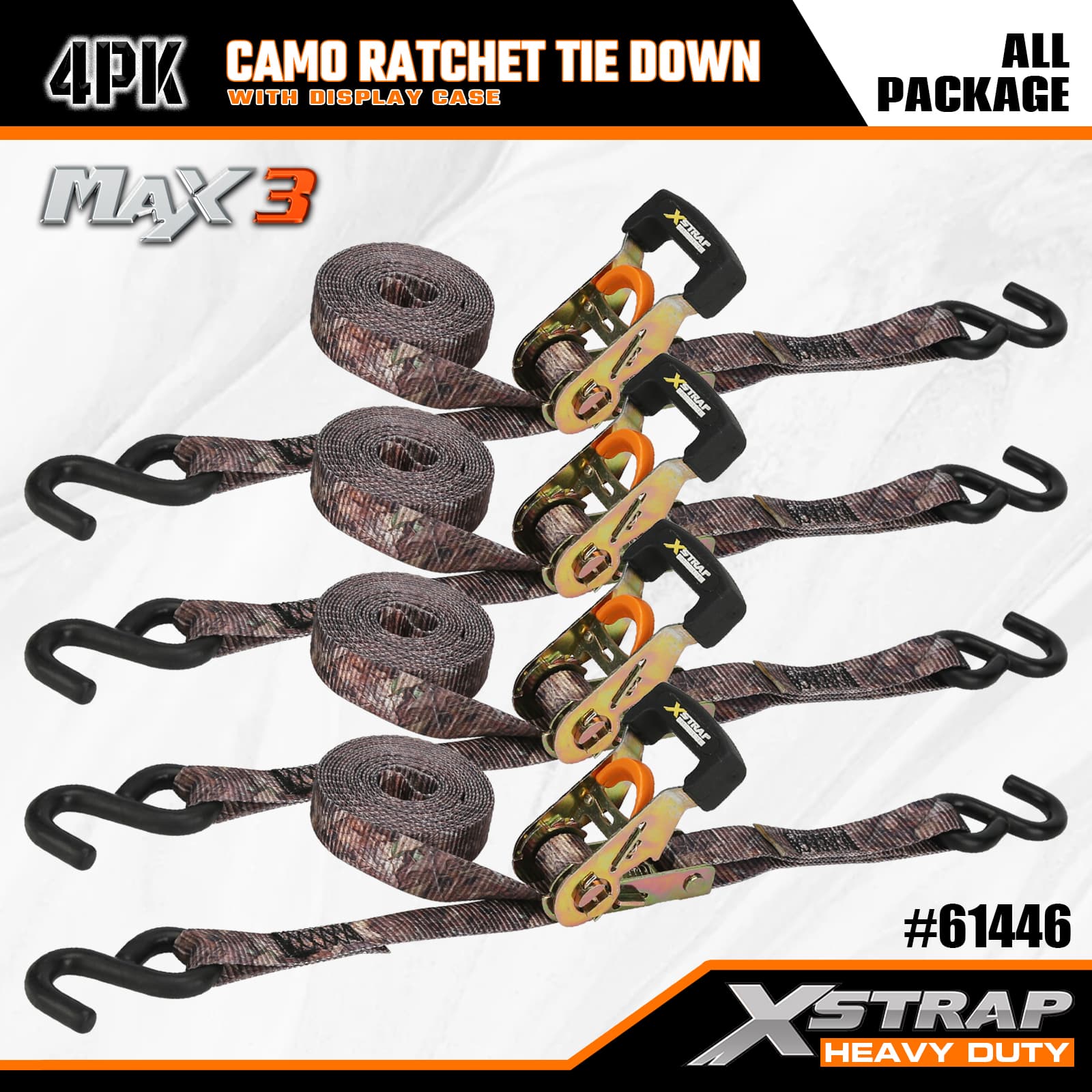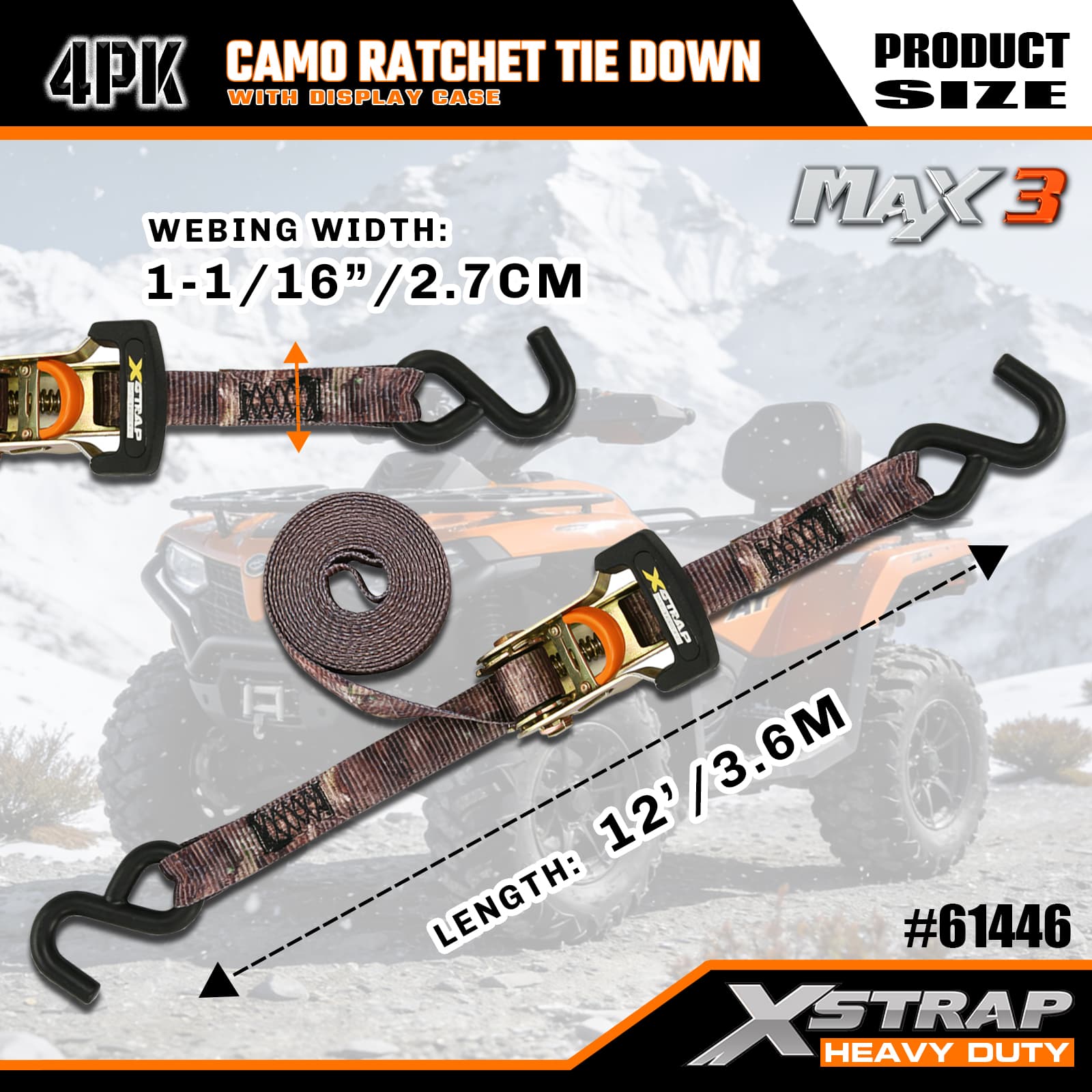 Xstrap 4 Pack Camo Ratchet Te Down, 1-1/16 x 12’ polyester Tie Down Ratchet Pull Ratchet, 1000lbs Cargo Lashing تسمه های ایمن با قلاب S برای کامیون وانت، SUV، Car Top Racks Bockup, Lawat S, Lightow تراکتور.