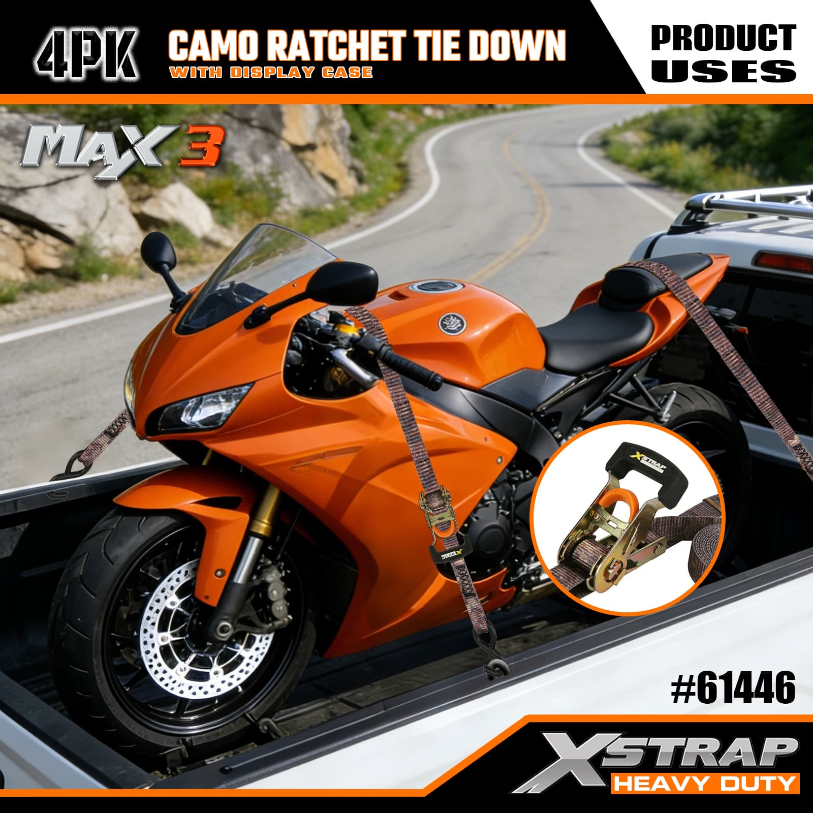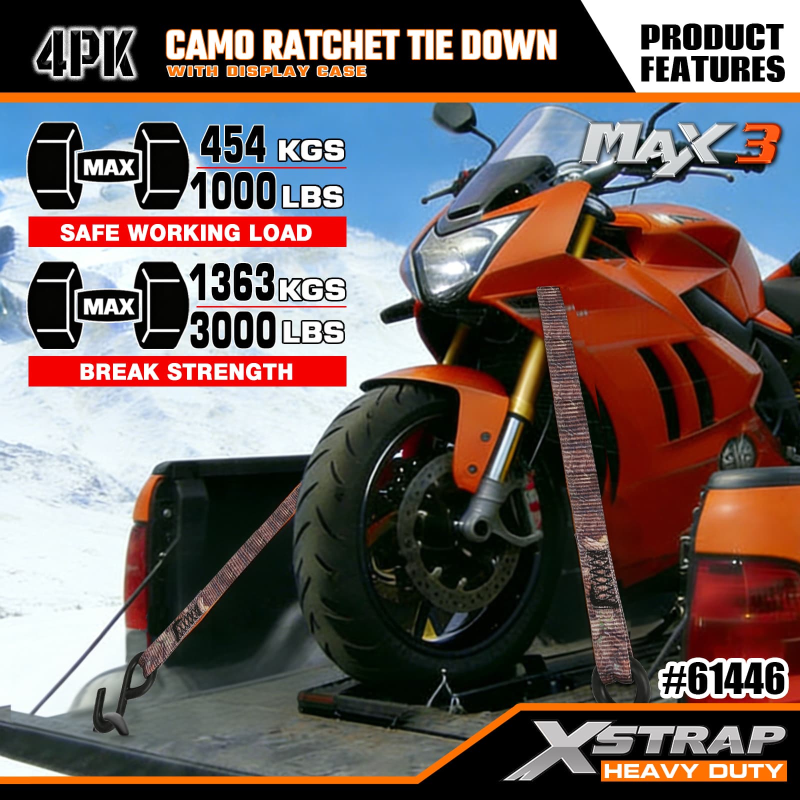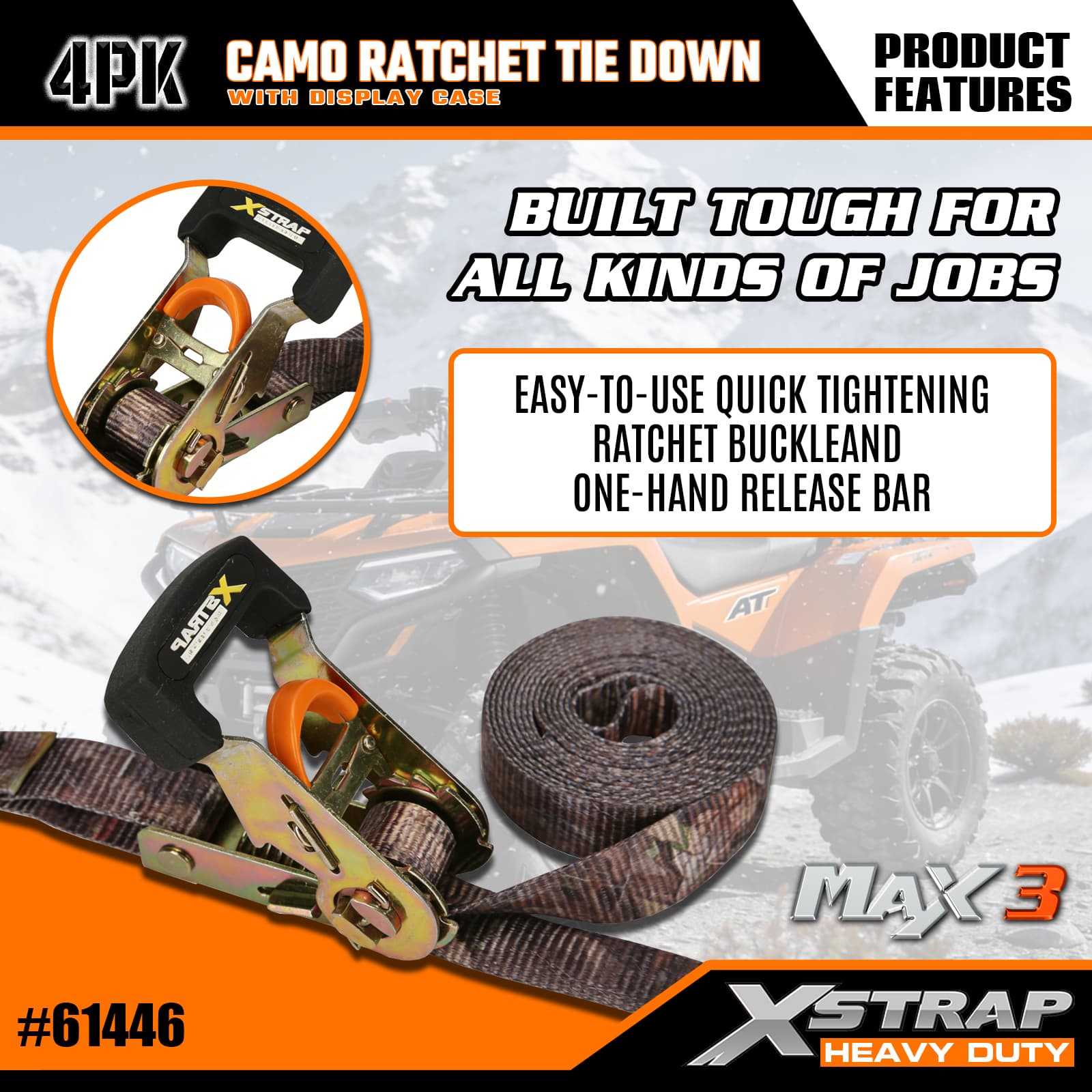 Xstrap 4 Pack Camo Ratchet Te Down, 1-1/16 x 12’ polyester Tie Down Ratchet Pull Ratchet, 1000lbs Cargo Lashing تسمه های ایمن با قلاب S برای کامیون وانت، SUV، Car Top Racks Bockup, Lawat S, Lightow تراکتور.