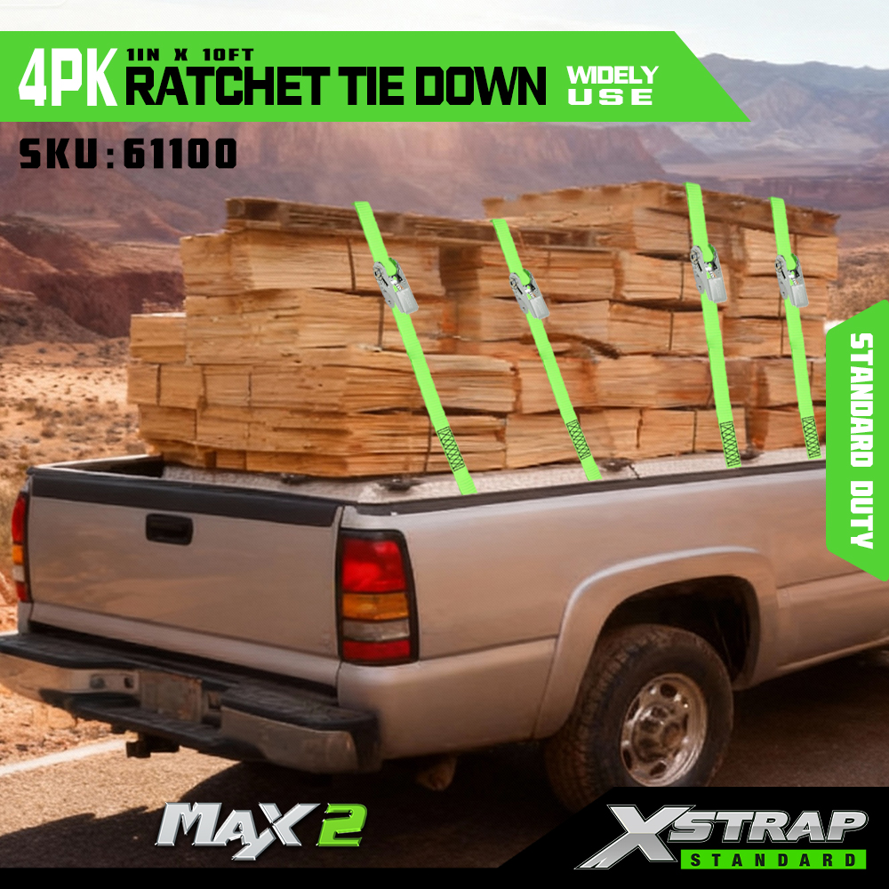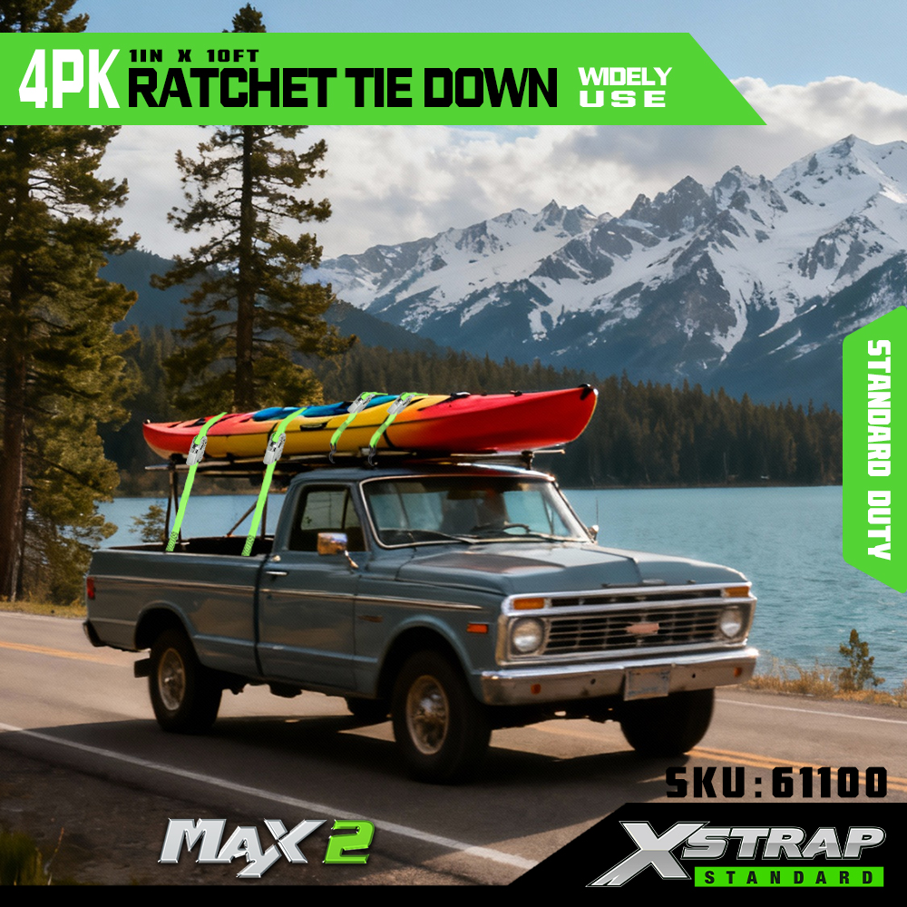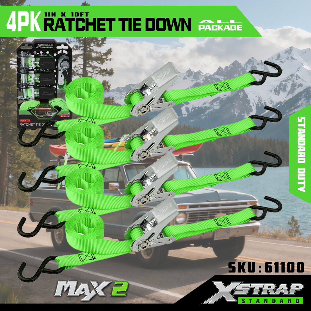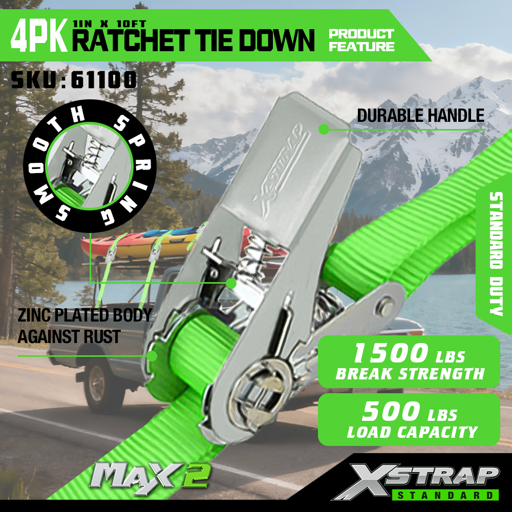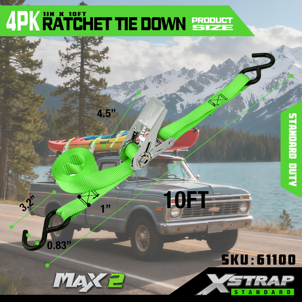 Xstrap 4 Pack Ratchet Te Down، بند 1 اینچی x15 اینچی پلی استر بند بند ضامن دار کششی، ظرفیت 500 پوندی تسمه ایمن با قلاب S برای کامیون وانت، موتورسیکلت تریلر سبک، قایق ماهیگیری سبک، جت اسکی، Sn.