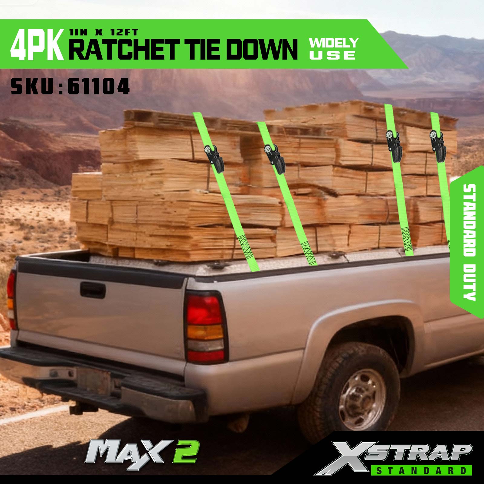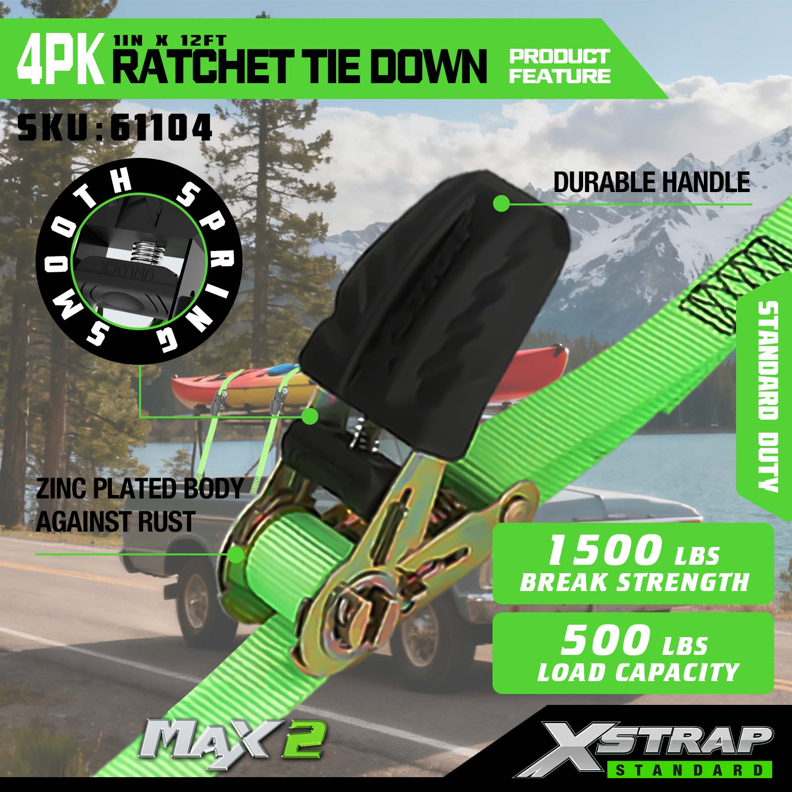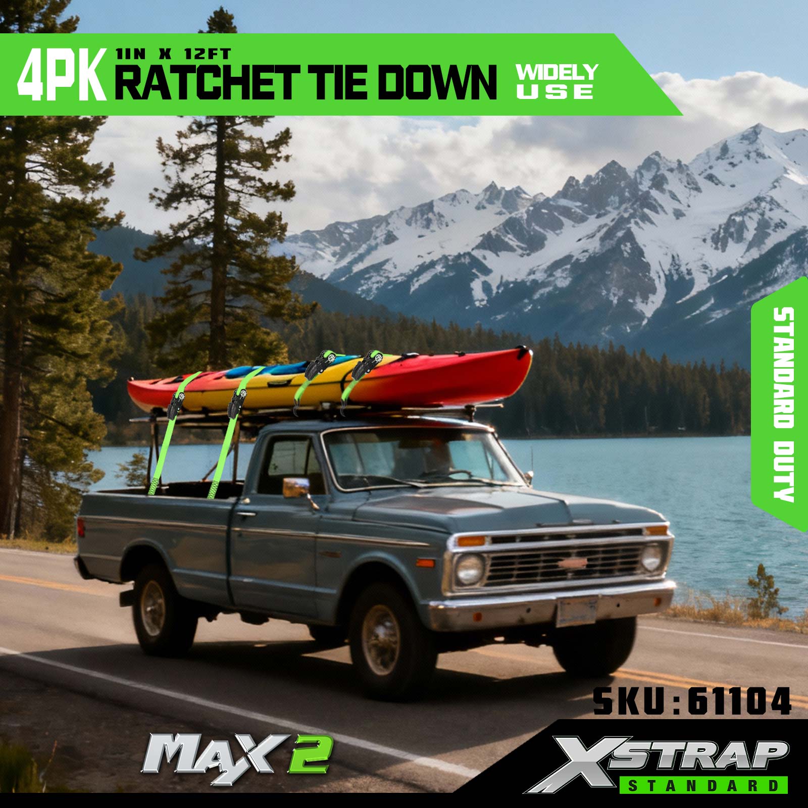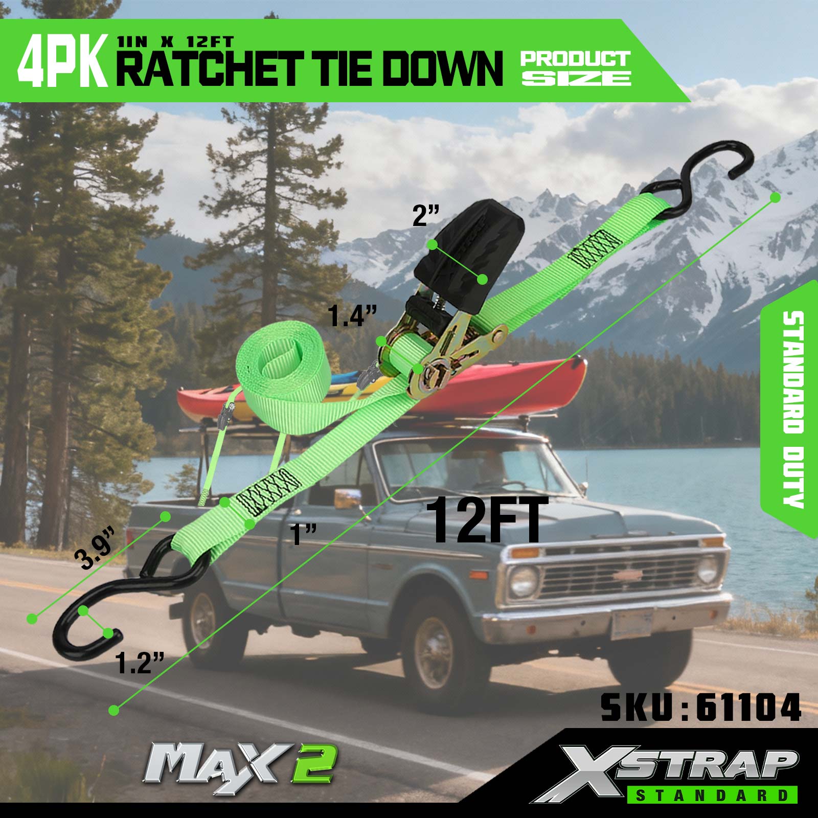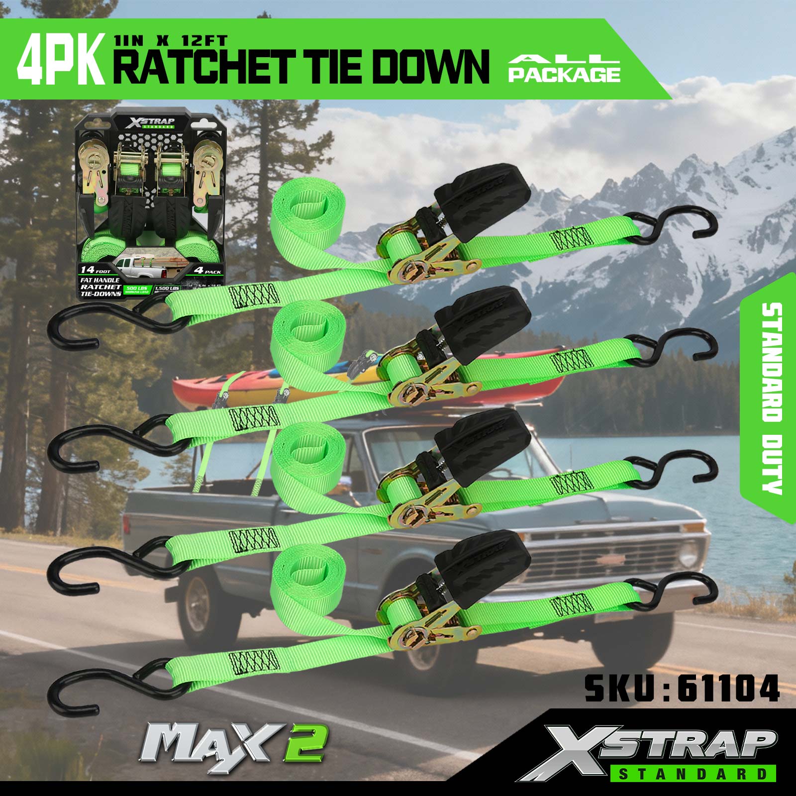Xstrap 4 Pack Ratchet Tie Down، بند 1 اینچی x12 اینچی پلی استر بند ضامن دار کششی، ظرفیت 500 پوندی تسمه های ایمن بندکشی بار با قلاب S برای کامیون وانت، موتورسیکلت تریلر سبک، قایق ماهیگیری سبک، جت اسکی،.