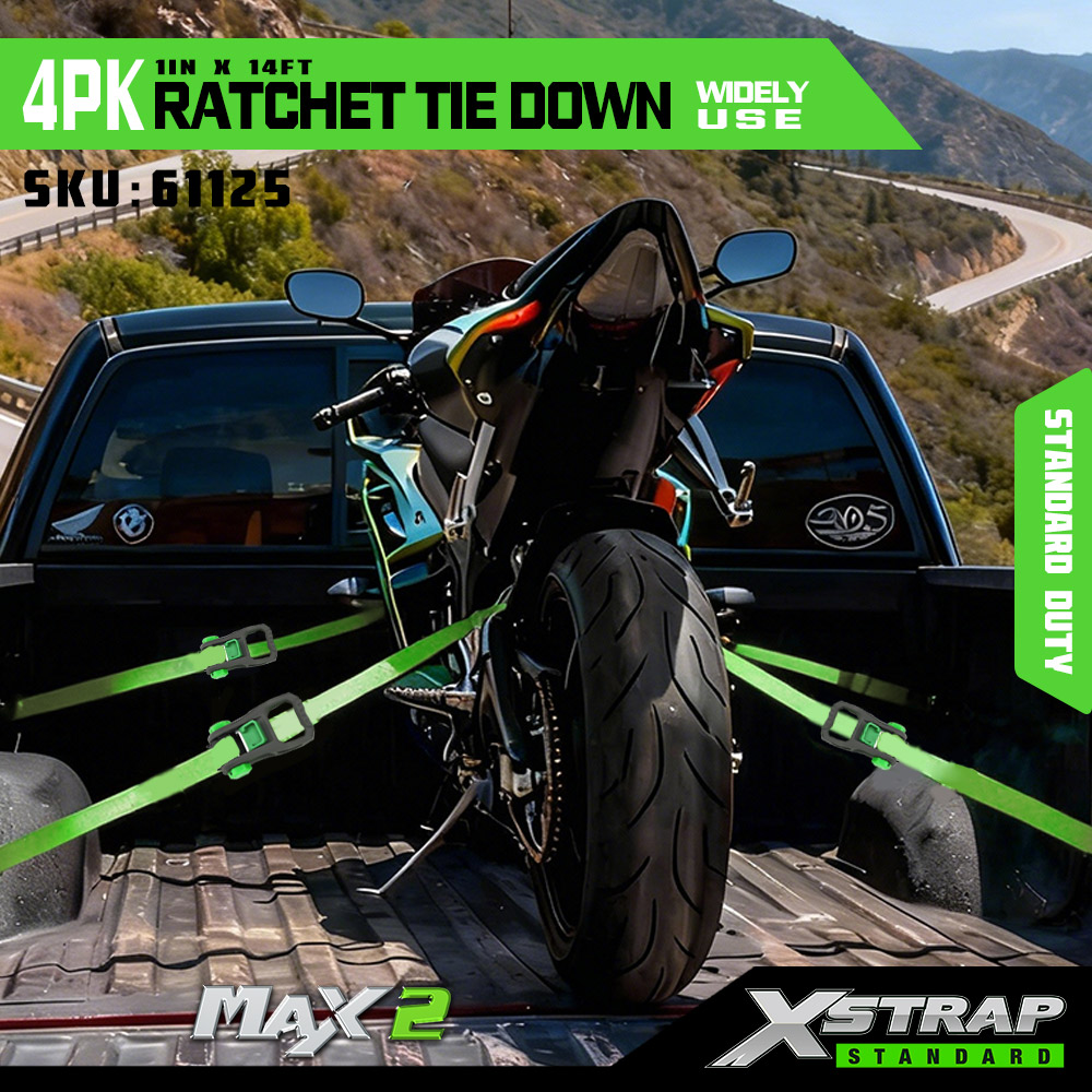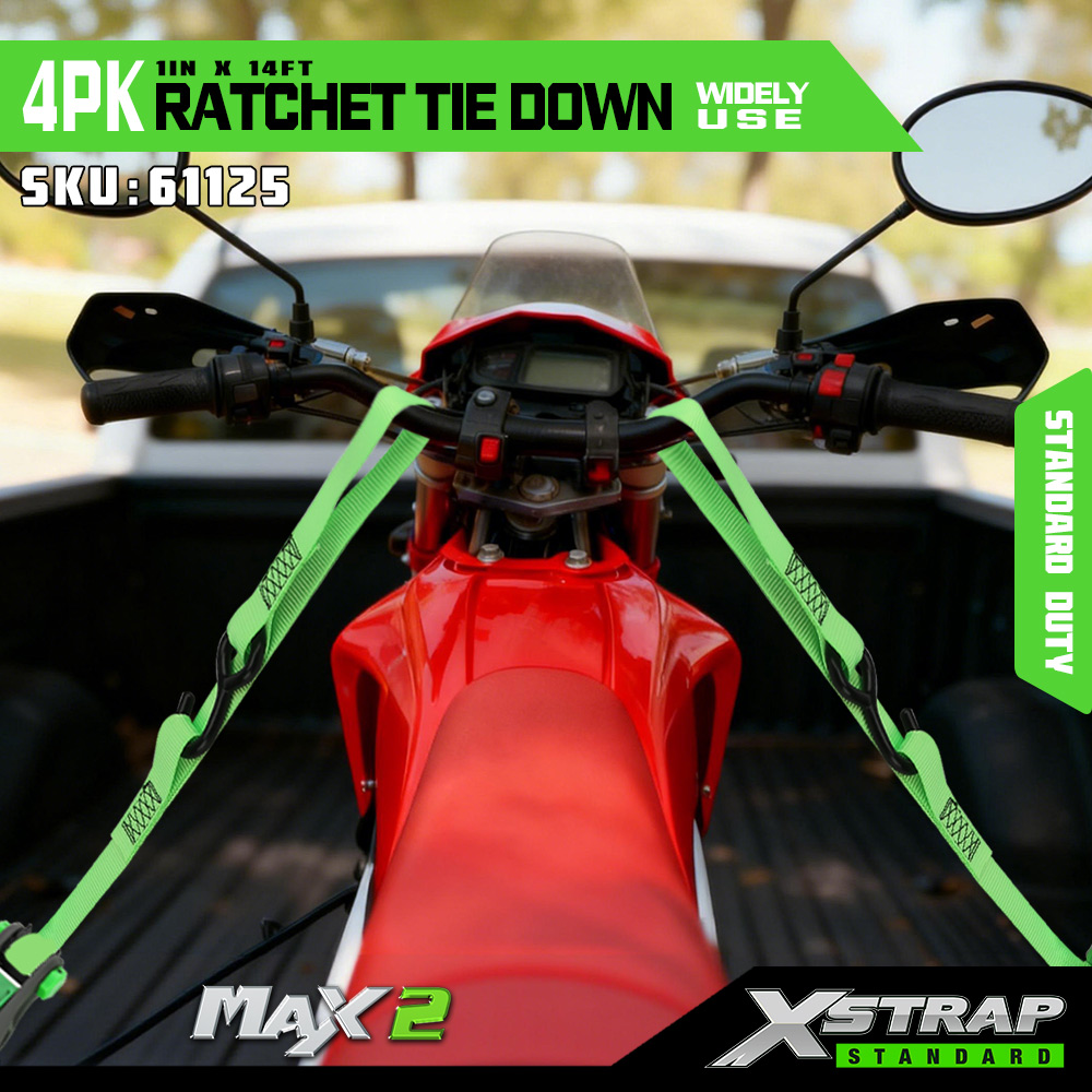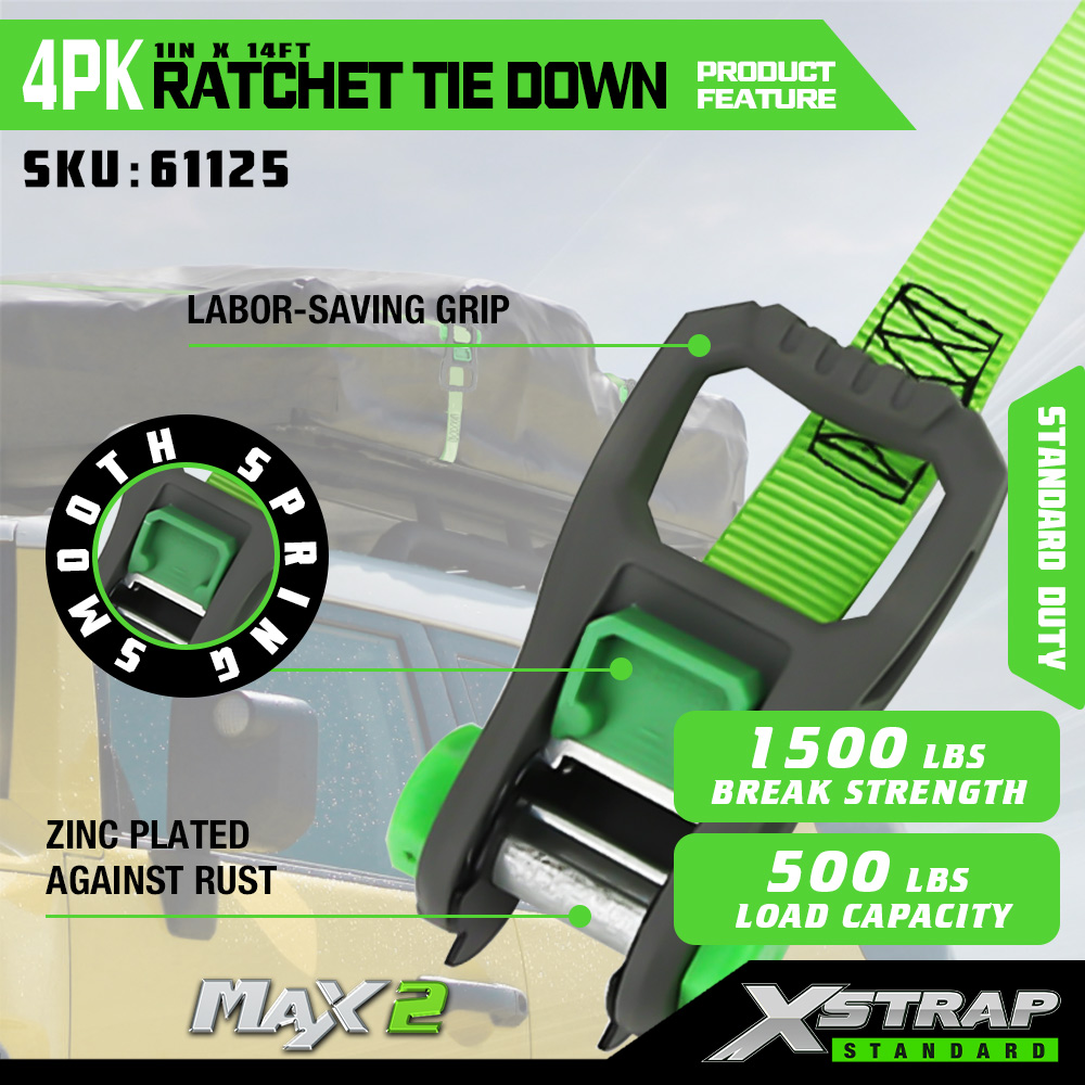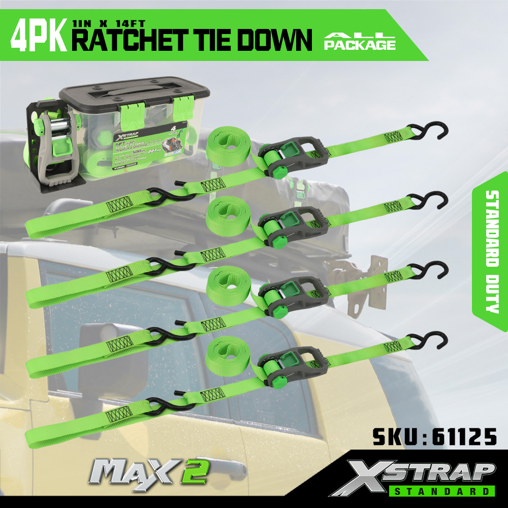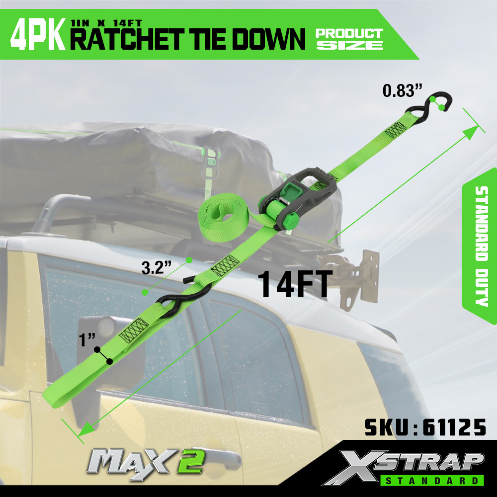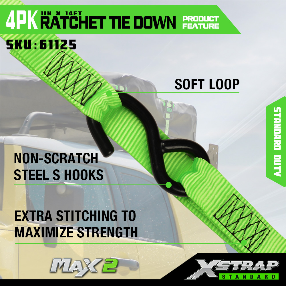 Xstrap 4 Pack Ratchet Tie Down، 1 اینچ x14 اینچ پلی استر با بند ضامن دار با حلقه نرم، تسمه های ایمن بندکشی باری با ظرفیت 500 پوند با قلاب S برای پیکاپ کامیون، SUV، Car Top Racks Motorcycle, Lawtn S, Lightsh.