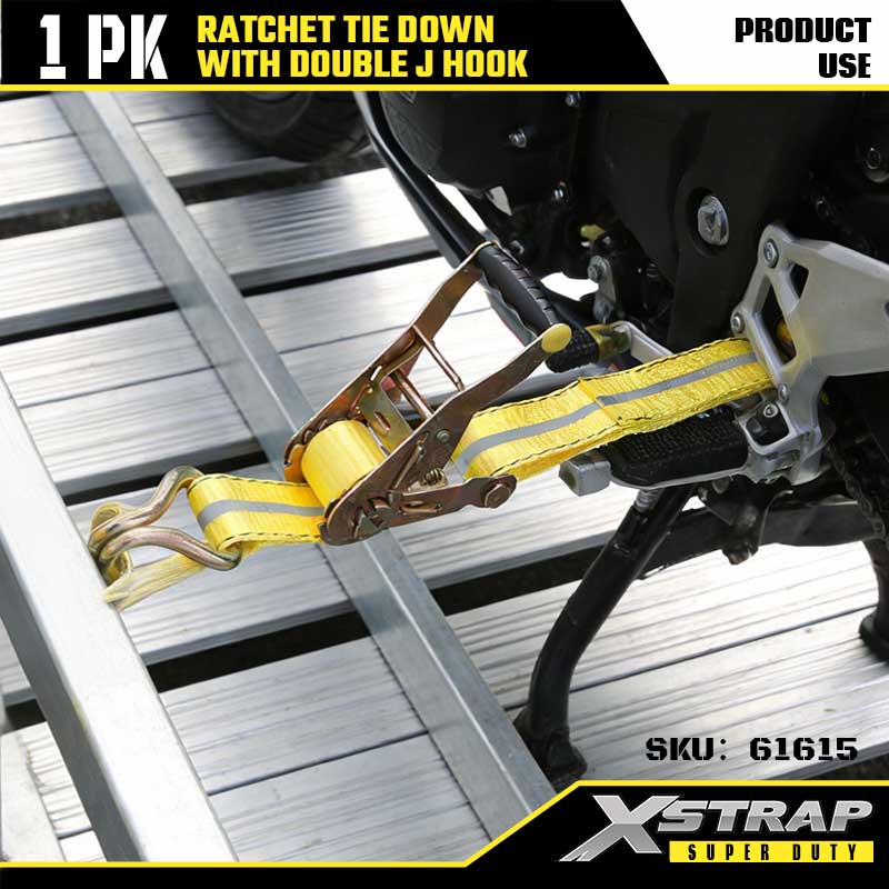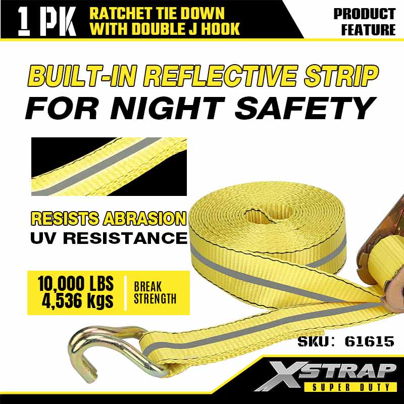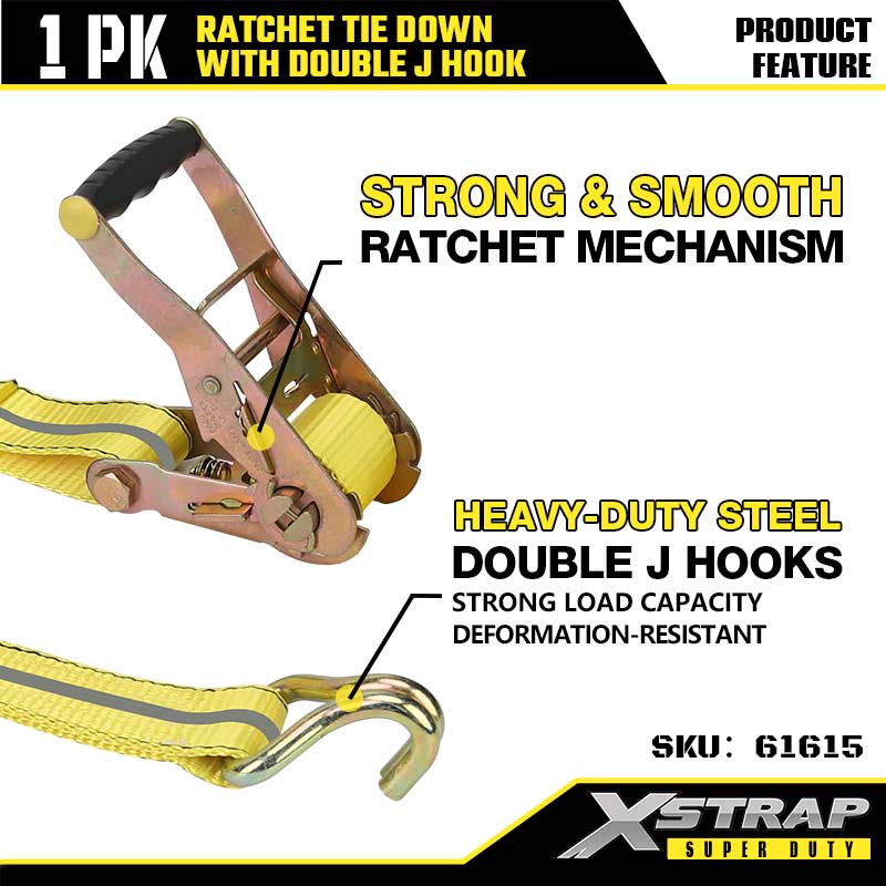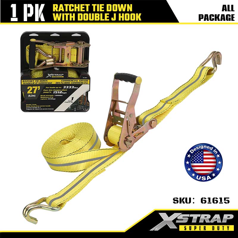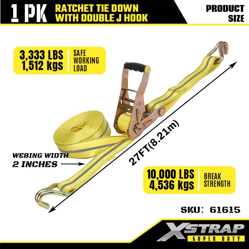 Xstrap Ratcet Tie Down with Double قلاب J، بند 27 اینچی پلی استر تسمه بند ضامن دار، 3333 پوندی ظرفیت تسمه ایمن با قلاب J برای تریلر سنگین، تخت تخت تریلر قایق اسکی، ماشین کوچک Heament،.